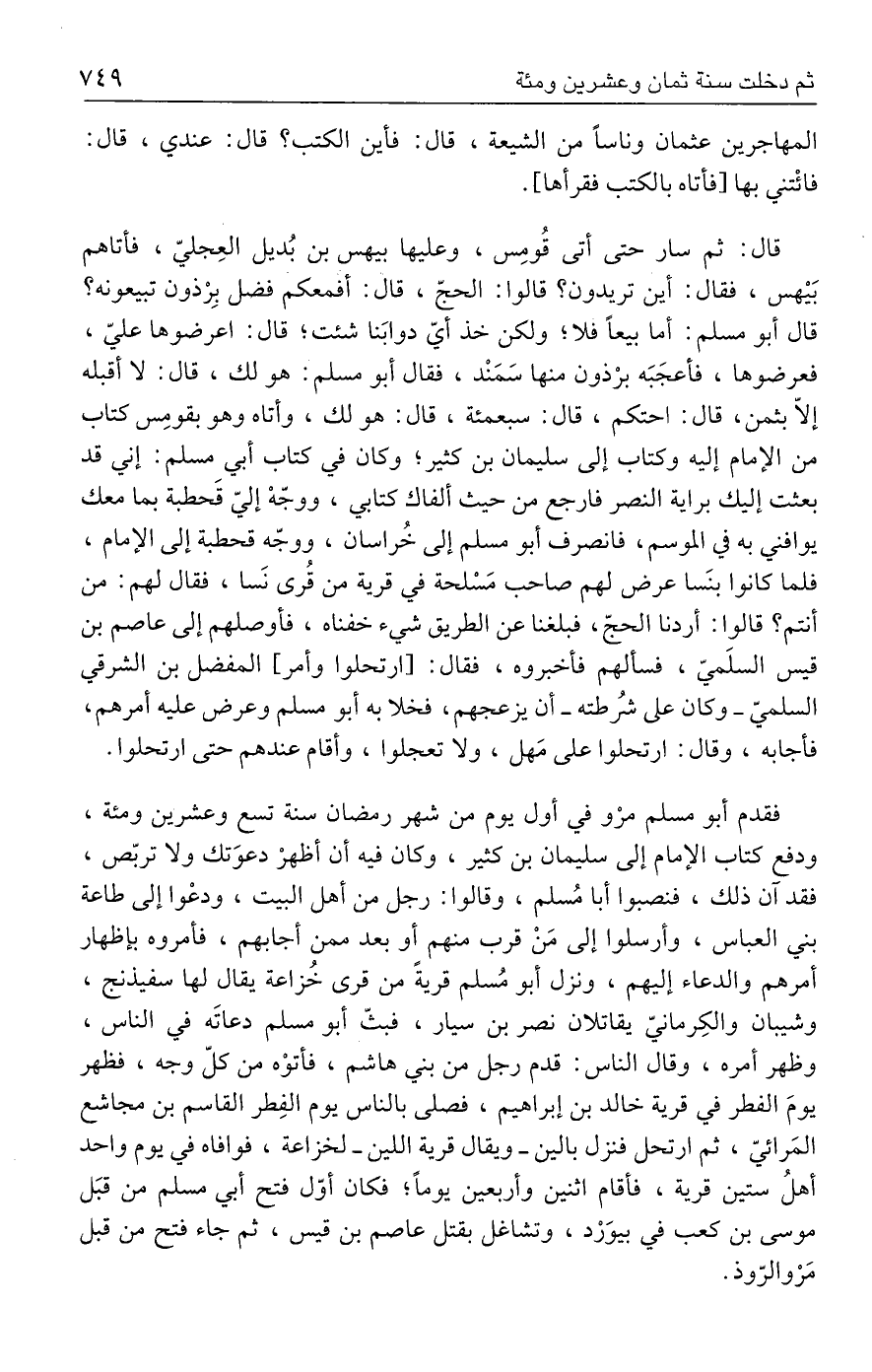 قال: ثم سار حتى أتى قُومِس، وعليها بيهس بن بُديل العِجليّ، فأتاهم بَيْهس، فقال: أين تريدون؟ قالوا: الحجّ، قال: أفمعكم فضل بِرْذون تبيعونه؟ قال أبو مسلم: أما بيعًا فلا؛ ولكن خذ أيّ دوابَنا شئت؛ قال: اعرضوها عليّ، فعرضوها، فأعجَبَه برْذون منها سَمَنْد، فقال أبو مسلم: هو لك، قال: لا أقبله إلّا بثمن، قال: احتكم، قال: سبعمئة، قال: هو لك، وأتاه وهو بقومِس كتاب من الإمام إليه وكتاب إلى سليمان بن كثير؛ وكان في كتاب أبي مسلم: إني قد بعثت إليك براية النصر فارجع من حيث ألفاك كتابي، ووجّهْ إليّ قَحطبة بما معك يوافني به في الموسم، فانصرف أبو مسلم إلى خُراسان، ووجّه قحطبة إلى الإمام، فلما كانوا بنَسا عرض لهم صاحب مَسْلحة في قرية من قُرى نَسا، فقال لهم: من أنتم؟ قالوا: أردنا الحجّ، فبلغنا عن الطريق شيء خفناه، فأوصلهم إلى عاصم بن قيس السلَميّ، فسألهم فأخبروه، فقال: [ارتحلوا وأمر] المفضل بن الشرقي السلميّ - وكان على شُرطته - أن يزعجهم، فخلا به أبو مسلم وعرض عليه أمرهم، فأجابه، وقال: ارتحلوا على مَهل، ولا تعجلوا، وأقام عندهم حتى ارتحلوا.