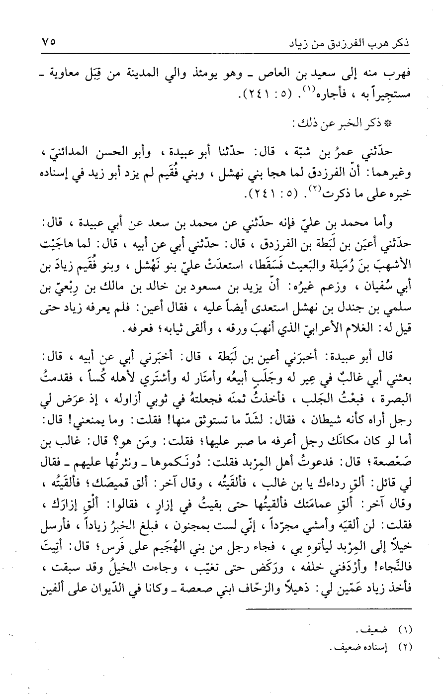 حدّثني عمرُ بن شبّة، قال: حدّثنا أبو عبيدة، وأبو الحسن المدائنيّ، وغيرهما: أنّ الفرزدق لما هجا بني نهشل، وبني فُقَيم لم يزد أبو زيد في إسناده خبره على ما ذكرت (٢). (٥: ٢٤١).
