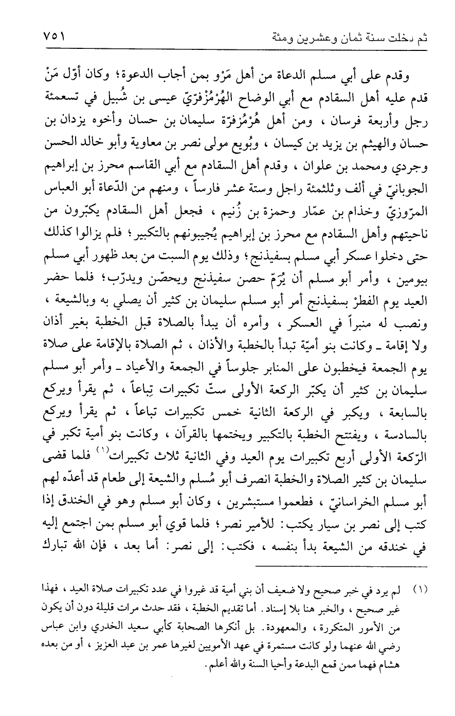 وقدم على أبي مسلم الدعاة من أهل مَرْو بمن أجاب الدعوة؛ وكان أوّل مَنْ قدم عليه أهل السقادم مع أبي الوضاح الهُرْمُزْفرّيّ عيسى بن شُبيل في تسعمئة رجل وأربعة فرسان، ومن أهل هُرْمُزفرّة سليمان بن حسان وأخوه يزدان بن حسان والهيثم بن يزيد بن كيسان، وبُويع مولى نصر بن معاوية وأبو خالد الحسن وجردي ومحمد بن علوان، وقدم أهل السقادم مع أبي القاسم محرز بن إبراهيم الجوبانيّ في ألف وثلثمئة راجل وستة عشر فارسًا، ومنهم من الدّعاة أبو العباس المرّوزيّ وخذام بن عمّار وحمزة بن زُنيم، فجعل أهل السقادم يكبّرون من ناحيتهم وأهل السقادم مع محرز بن إبراهيم يُجيبونهم بالتكبير؛ فلم يزالوا كذلك حتى دخلوا عسكر أبي مسلم بسفيذنج؛ وذلك يوم السبت من بعد ظهور أبي مسلم بيومين، وأمر أبو مسلم أن يُرَمّ حصن سفيذنج ويحصّن ويدرّب؛ فلما حضر العيد يوم الفطرْ بسفيذنج أمر أبو مسلم سليمان بن كثير أن يصلي به وبالشيعة، ونصب له منبرًا في العسكر، وأمره أن يبدأ بالصلاة قبل الخطبة بغير أذان ولا إقامة - وكانت بنو أميّة تبدأ بالخطبة والأذان، ثم الصلاة بالإقامة على صلاة يوم الجمعة فيخطبون على المنابر جلوسًا في الجمعة والأعياد - وأمر أبو مسلم سليمان بن كثير أن يكبّر الركعة الأولى ستّ تكبيرات تِباعًا، ثم يقرأ ويركع بالسابعة، ويكبر في الركعة الثانية خمس تكبيرات تباعًا، ثم يقرأ ويركع بالسادسة، ويفتتح الخطبة بالتكبير ويختمها بالقرآن، وكانت بنو أمية تكبر في الرّكعة الأولى أربع تكبجرات يوم العيد وفي الثانية ثلاث تكبيرات (١) فلما قضى سليمان بن كثير الصلاة والخطبة انصرف أبو مُسلم والشيعة إلى طعام قد أعدّه لهم أبو مسلم الخراسانيّ، فطعموا مستبشرين، وكان أبو مسلم وهو في الخندق إذا كتب إلى نصر بن سيار يكتب: للأمير نصر؛ فلما قوي أبو مسلم بمن اجتمع إليه في خندقه من الشيعة بدأ بنفسه، فكتب: إلى نصر: أما بعد، فإن الله تبارك