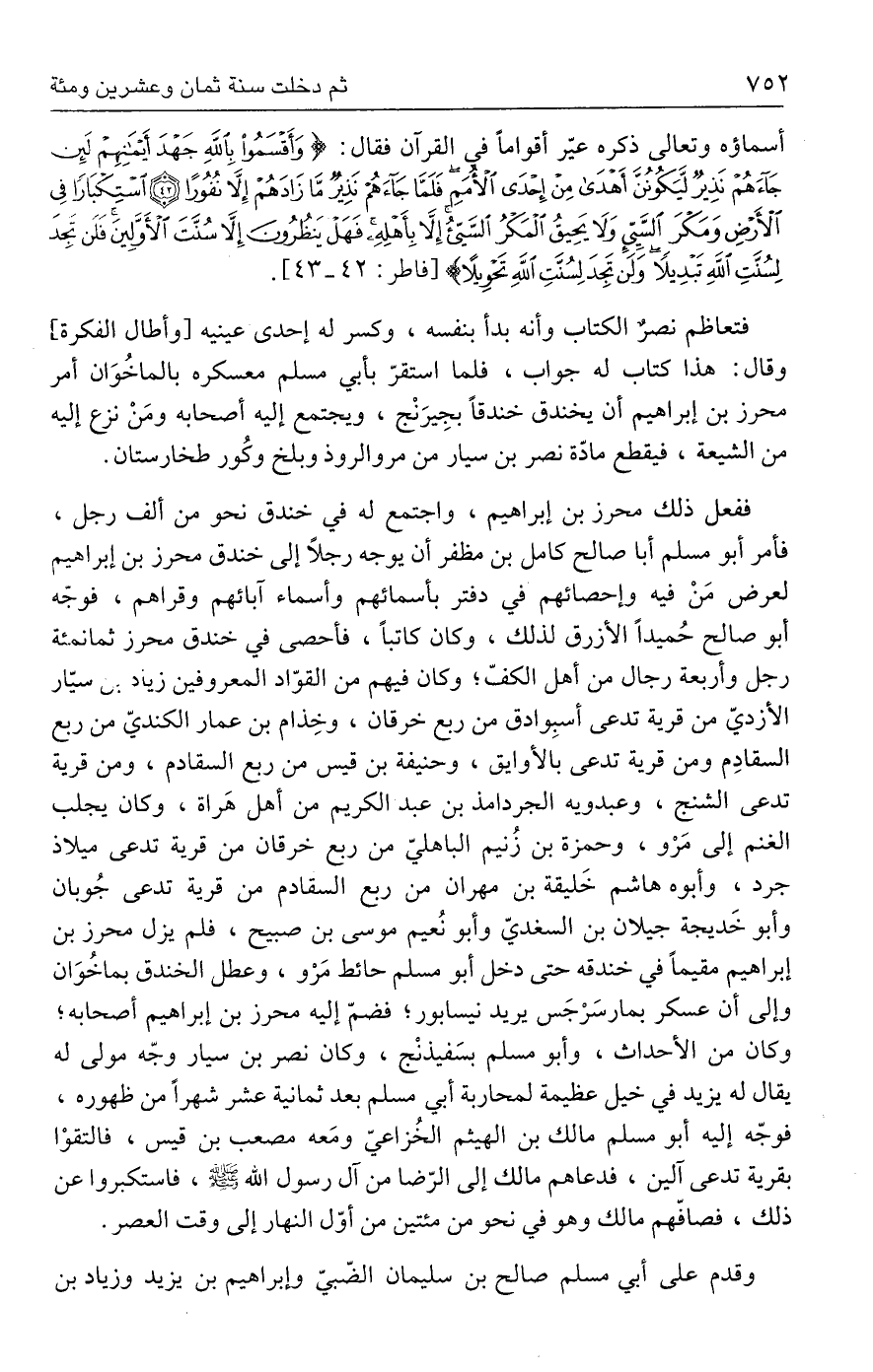 ففعل ذلك محرز بن إبراهيم، واجتمع له في خندق نحو من ألف رجل، فأمر أبو مسلم أبا صالح كامل بن مظفر أن يوجه رجلًا إلى خندق محرز بن إبراهيم لعرض مَنْ فيه وإحصائهم في دفتر بأسمائهم وأسماء آبائهم وقراهم، فوجّه أبو صالح حُميدًا الأزرق لذلك، وكان كاتبًا، فأحصى في خندق محرز ثمانمئة رجل وأربعة رجال من أهل الكفّ؛ وكان فيهم من القوّاد المعروفين زيادة بن سيّار الأزديّ من قرية تدعى أسبِوادق من ربع خرقان، وخِذام بن عمار الكنديّ من ربع السقادِم ومن قرية تدعى بالأوايق، وحنيفة بن قيس من ربع السقادم، ومن قرية تدعى الشنج، وعبدويه الجردامذ بن عبد الكريم من أهل هَراة، وكان يجلب الغنم إلى مَرْو، وحمزة بن زُنيم الباهليّ من ربع خرقان من قرية تدعى ميلاذ جرد، وأبوه هاشم خَليقة بن مهران من ربع السقادم من قرية تدعى جُوبان وأبو خَديجة جيلان بن السغديّ وأبو نُعيم موسى بن صبيح، فلم يزل محرز بن إبراهيم مقيمًا في خندقه حتى دخل أبو مسلم حائط مَرْو، وعطل الخندق بماخُوَان وإلى أن عسكر بمارسَرْجَس يريد نيسابور؛ فضمّ إليه محرز بن إبراهيم أصحابه؛ وكان من الأحداث، وأبو مسلم بسَفيذنْج، وكان نصر بن سيار وجّه مولى له يقال له يزيد في خيل عظيمة لمحاربة أبي مسلم بعد ثمانية عشر شهرًا من ظهوره، فوجّه إليه أبو مسلم مالك بن الهيثم الخُزاعيّ ومَعه مصعب بن قيس، فالتقوْا بقرية تدعى آلين، فدعاهم مالك إلى الرّضا من آل رسول الله - صلى الله عليه وسلم -، فاستكبروا عن ذلك، فصافّهم مالك وهو في نحو من مئتين من أوّل النهار إلى وقت العصر.