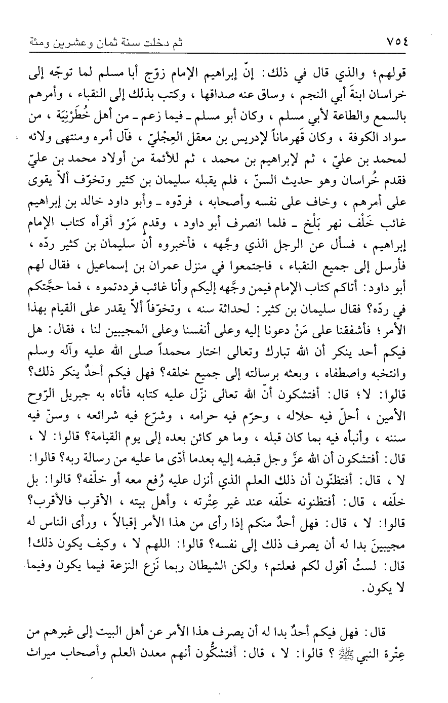 قال: فهل فيكم أحدٌ بدا له أن يصرف هذا الأمر عن أهل البيت إلى غيرهم من عِتْرة النبي - صلى الله عليه وسلم -؟ قالوا: لا، قال: أفتشكُّون أنهم معدن العلم وأصحاب ميراث