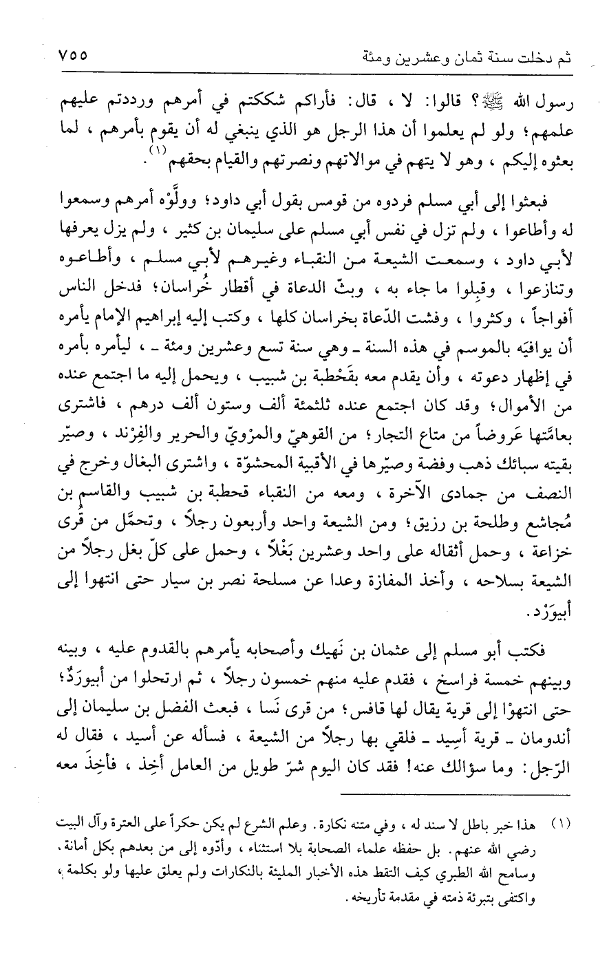 (١) هذا خبر باطل لا سند له، وفي متنه نكارة. وعلم الشرع لم يكن حكرًا على العترة وآل البيت رضي الله عنهم. بل حفظه علماء الصحابة بلا استثناء، وأدّوه إلى من بعدهم بكل أمانة, وسامح الله الطبري كيف التقط هذه الأخبار المليئة بالنكارات ولم يعلق عليها ولو بكلمة، واكتفى بتبرئة ذمته في مقدمة تأريخه.