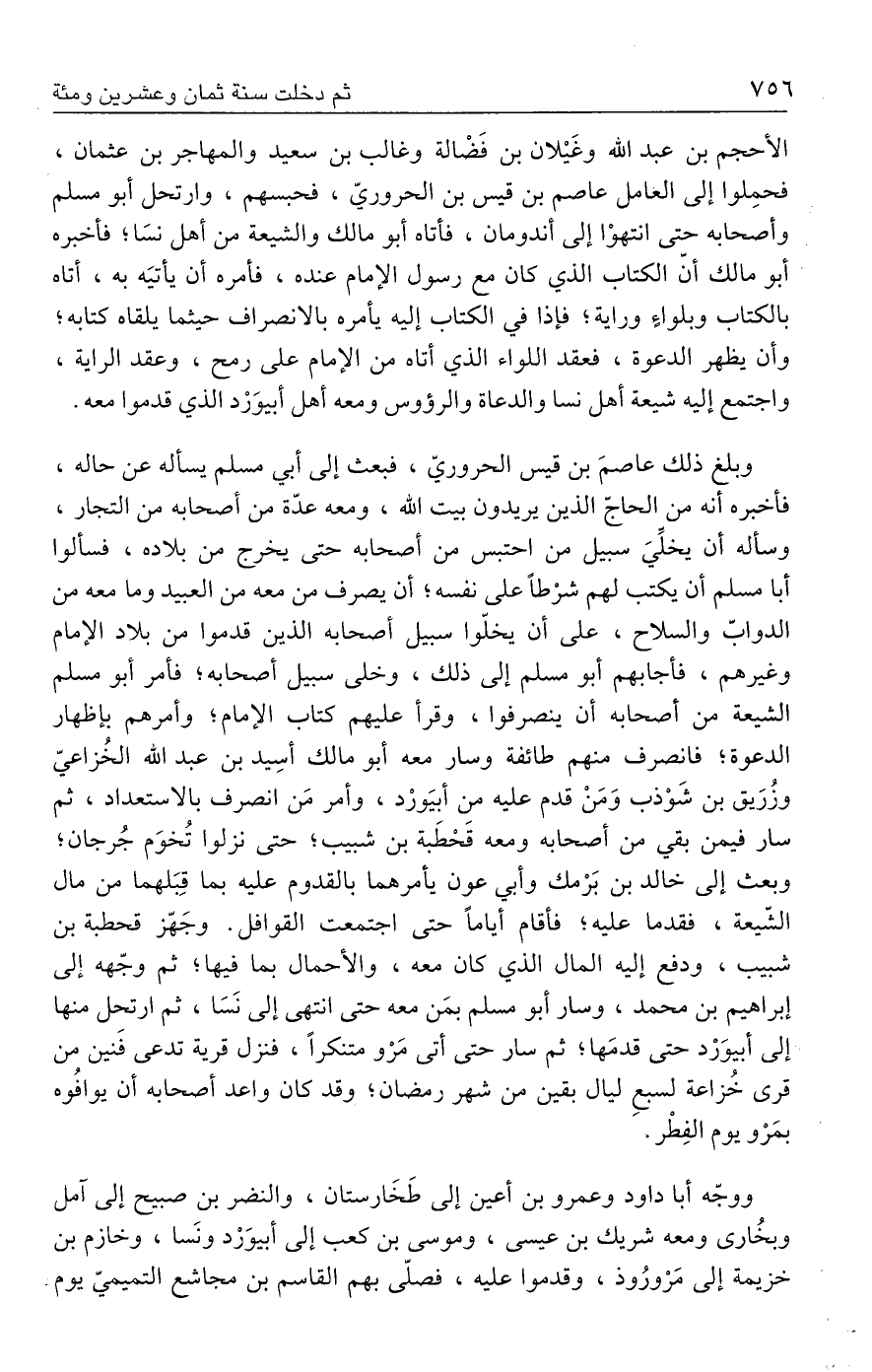 وبلغ ذلك عاصمَ بن قيس الحروريّ، فبعث إلى أبي مسلم يسأله عن حاله، فأخبره أنه من الحاجّ الذين يريدون بيت الله، ومعه عدّة من أصحابه من التجار، وسأله أن يخلِّيَ سبيل من احتبس من أصحابه حتى يخرج من بلاده، فسألوا أبا مسلم أن يكتب لهم شرْطًا على نفسه؛ أن يصرف من معه من العبيد وما معه من الدوابّ والسلاح، على أن يخلّوا سبيل أصحابه الذين قدموا من بلاد الإمام وغيرهم، فأجابهم أبو مسلم إلى ذلك، وخلى سبيل أصحابه؛ فأمر أبو مسلم الشيعة من أصحابه أن ينصرفوا، وقرأ عليهم كتاب الإمام، وأمرهم بإظهار الدعوة؛ فانصرف منهم طائفة وسار معه أبو مالك أسِيد بن عبد الله الخُزاعيّ وزُرَيق بن شَوْذب وَمَنْ قدم عليه من أبيَورْد، وأمر مَن انصرف بالاستعداد، ثم سار فيمن بقي من أصحابه ومعه قَحْطَبة بن شبيب؛ حتى نزلوا تُخوَم جُرجان؛ وبعث إلى خالد بن بَرْمك وأبي عون يأمرهما بالقدوم عليه بما قِبَلهما من مال الشّيعة، فقدما عليه؛ فأقام أيامًا حتى اجتمعت القوافل. وجَهّز قحطبة بن شبيب، ودفع إليه المال الذي كان معه، والأحمال بما فيها؛ ثم وجّهه إلى إبراهيم بن محمد، وسار أبو مسلم بمَن معه حتى انتهى إلى نَسَا، ثم ارتحل منها إلى أبيوَرْد حتى قدمَها؛ ثم سار حتى أتى مَرْو متنكرًا، فنزل قرية تدعى فَنين من قرى خُزاعة لسبعِ ليال بقين من شهر رمضان؛ وقد كان واعد أصحابه أن يوافُوه بمَرْو يوم الفِطْر.