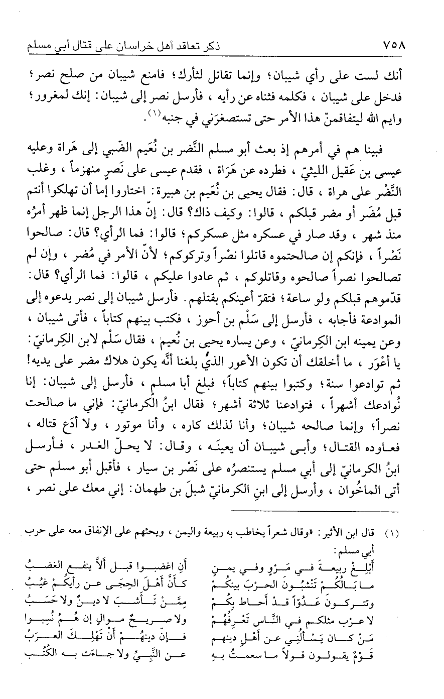 (١) قال ابن الأثير: " وقال شعرًا يخاطب به ربيعة واليمن، ويحثهم على الإنفاق معه على حرب أبي مسلم: