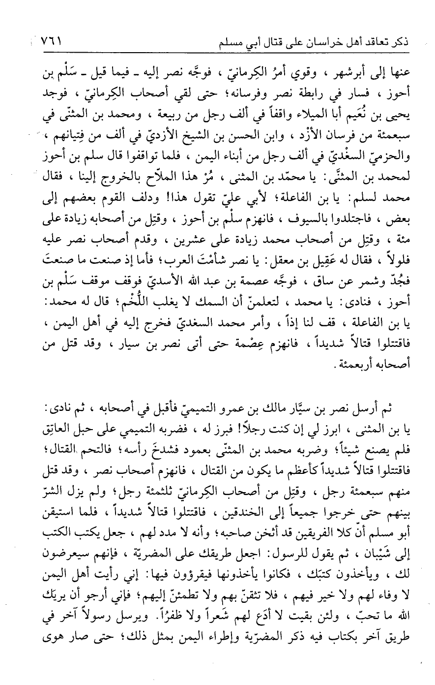 ثم أرسل نصر بن سيَّار مالك بن عمرو التميميّ فأقبل في أصحابه، ثم نادى: يا بن المثنى، ابرز لي إن كنت رجلًا! فبرز له، فضربه التميمي على حبل العاتِق فلم يصنع شيئًا؛ وضربه محمد بن المثنّى بعمود فشدخَ رأسه؛ فالتحم القتال؛ فاقتتلوا قتالًا شديدًا كأعظم ما يكون من القتال، فانهزم أصحاب نصر، وقد قتل منهم سبعمئة رجل، وقتِل من أصحاب الكِرمانيّ ثلثمئة رجل؛ ولم يزل الشرّ بينهم حتى خرجوا جميعًا إلى الخندقين، فاقتتلوا قتالًا شديدًا، فلما استيقن أبو مسلم أنّ كلا الفريقين قد أثخن صاحبه؛ وأنه لا مدد لهم، جعل يكتب الكتب إلى شَيْبان، ثم يقول للرسول: اجعل طريقك على المضريّة، فإنهم سيعرضون لك، ويأخذون كتبَك، فكانوا يأخذونها فيقرؤون فيها: إني رأيت أهل اليمن لا وفاء لهم ولا خير فيهم، فلا تثقنّ بهم ولا تطمئنّ إليهم؛ فإني أرجو أن يريَك الله ما تحبّ، ولئن بقيت لا أدَع لهم شَعرًا ولا ظفرًا. ويرسل رسولًا آخر في طريق آخر بكتاب فيه ذكر المضرّية وإطراء اليمن بمثل ذلك؛ حتى صار هوى