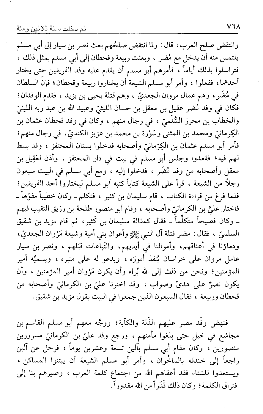 وانتقض صلح العرب، قال: ولما انتقض صلحُهم بعث نصر بن سيار إلى أبي مسلم يلتمس منه أن يدخل مع مُضر، وبعثت ربيعة وقحطان إلى أبي مسلم بمثل ذلك، فتراسلوا بذلك أيامًا، فأمرهم أبو مسلم أن يقدم عليه وفد الفريقين حتى يختار أحدهما، ففعلوا، وأمر أبو مسلم الشيعة أن يختاروا ربيعة وقحطان؛ فإنّ السلطان في مُضَر، وهم عمال مروان الجعديّ، وهم قتلة يحيى بن يزيد، فقدم الوفدان؛ فكان في وفد مُضر عقيل بن معقل بن حسان الليثيّ وعبيد الله بن عبد ربه الليثيّ والخطاب بن محرز السُّلَميّ، في رجال منهم، وكان في وفد قحطان عثمان بن الكِرمانيّ ومحمد بن المثنى وسَوْرة بن محمد بن عزيز الكنديّ، في رجال منهم؛ فأمر أبو مسلم عثمان بن الكِرْمانيّ وأصحابه فدخلوا بستان المحتفز، وقد بسط لهم فيه؛ فقعدوا وجلس أبو مسلم في بيت في دار المحتفز، وأذن لعَقِيل بن معقل وأصحابه من وفد مُضر، فدخلوا إليه، ومع أبي مسلم في البيت سبعون رجلًا من الشيعة، قرأ على الشيعة كتابًا كتبه أبو مسلم ليختاروا أحد الفريقين؛ فلما فرغ من قراءة الكتاب، قام سليمان بن كثير، فتكلم - وكان خطيبًا مفوّهًا - فاختار عليَّ بن الكرمانيّ وأصحابه، وقام أبو منصور طلحة بن رزيق النقيب فيهم - وكان فصيحًا متكلِّمًا - فقال كمقالة سليمان بن كَثير، ثم قام مزيد بن شقيق السلميّ، فقال: مضر قتلة آل النبي - صلى الله عليه وسلم - وأعوان بني أمية وشيعة مَرْوان الجعديّ، ودماؤنا في أعناقهم، وأموالنا في أيديهم، والتّباعات قبَلهم، ونصر بن سيار عامل مروان على خراسان يُنفذ أمورَه، ويدعو له على منبره، ويسميِّه أمير المؤمنين؛ ونحن من ذلك إلى الله بُراء وأن يكون مَرْوان أميو المؤمنين، وأن يكون نصرٌ على هدىً وصواب، وقد اخترنا عليّ بن الكرماني وأصحابه من قحطان وربيعة، فقال السبعون الذين جمعوا في البيت بقول مزيد بن شقيق.