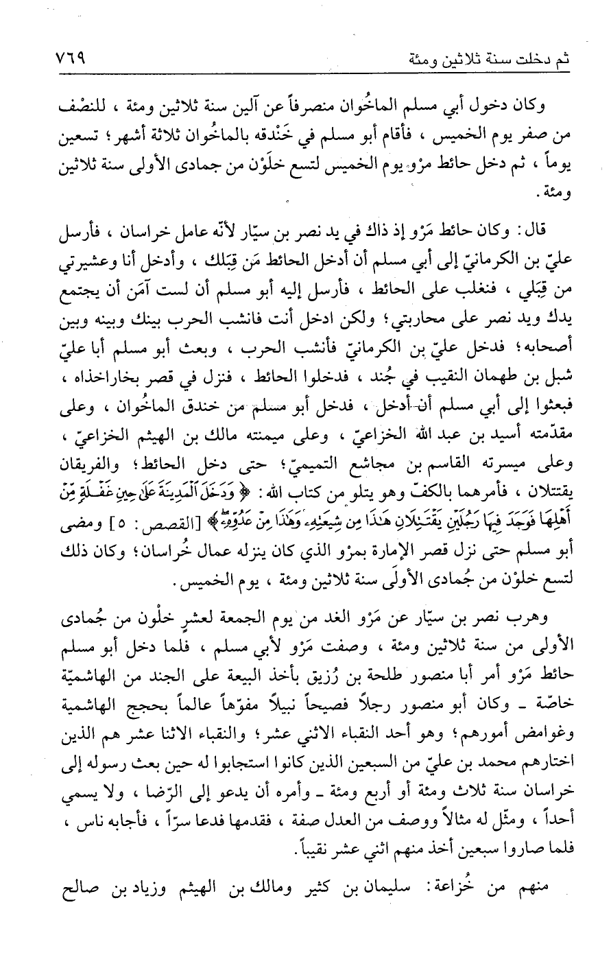 قال: وكان حائط مَرْو إذ ذاك في يد نصر بن سيّار لأنّه عامل خراسان، فأرسل على بن الكرمانيّ إلى أبي مسلم أن أدخل الحائط مَن قِبَلك، وأدخل أنا وعشيرتي من قِبَلي، فنغلب على الحائط، فأرسل إليه أبو مسلم أن لست آمَن أن يجتمع يدك ويد نصر على محاربتي؛ ولكن ادخل أنت فانشب الحرب بينك وبينه وبين أصحابه؛ فدخل عليّ ين الكرماني فأنشب الحرب، وبعث أبو مسلم أبا عليّ شبل بن طهمان النقيب في جُند، فدخلوا الحائط، فنزل في قصر بخاراخذاه، فبعثوا إلى أبي مسلم أن أدخل، فدخل أبو مسلم من خندق الماخُوان، وعلى مقدّمته أسيد بن عبد الله الخزاعيّ، وعلى ميمنته مالك بن الهيثم الخزاعيّ، وعلى ميسرته القاسم بن مجاشع التميميّ؛ حتى دخل الحائط؛ والفريقان يقتتلان، فأمرهما بالكفّ وهو يتلو من كتاب الله: {وَدَخَلَ الْمَدِينَةَ عَلَى حِينِ غَفْلَةٍ مِنْ أَهْلِهَا فَوَجَدَ فِيهَا رَجُلَيْنِ يَقْتَتِلَانِ هَذَا مِنْ شِيعَتِهِ وَهَذَا مِنْ عَدُوِّهِ} [القصص: ٥] ومضي أبو مسلم حتى نزل قصر الإمارة بمرْو الذي كان ينزله عمال خُراسان؛ وكان ذلك لتسع خلوْن من جُمادى الأوتى سنة ثلاثين ومئة، يوم الخميس.