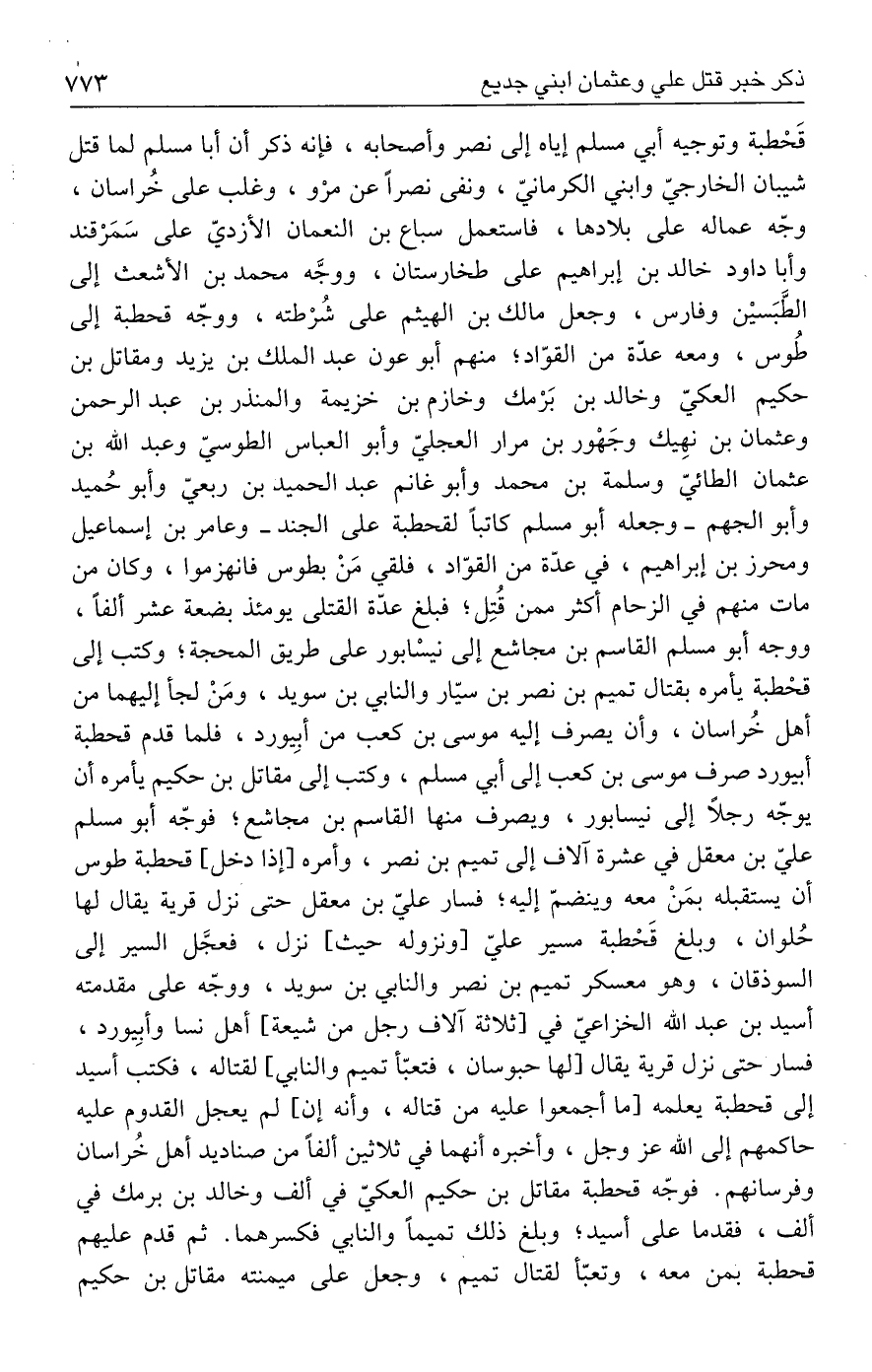 قَحْطبة وتوجيه أبي مسلم إياه إلى نصر وأصحابه، فإنه ذكر أن أبا مسلم لما قتل شيبان الخارجيّ وابني الكرمانيّ، ونفى نصرًا عن مرْو، وغلب على خُراسان، وجّه عماله على بلادها، فاستعمل سباع بن النعمان الأزديّ على سَمَرْقند وأبا داود خالد بن إبراهيم على طخارستان، ووجَّه محمد بن الأشعث إلى الطَّبَسيْن وفارس، وجعل مالك بن الهيثم على شُرْطته، ووجّه قحطبة إلى طُوس، ومعه عدّة من القوّاد؛ منهم أبو عون عبد الملك بن يزيد ومقاتل بن حكيم العكيّ وخالد بن بَرْمك وخازم بن خزيمة والمنذربن عبد الرحمن وعثمان بن نهِيك وجَهْور بن مرار العجليّ وأبو العباس الطوسيّ وعبد الله بن عثمان الطائيّ وسلمة بن محمد وأبو غانم عبد الحميد بن ربعيّ وأبو حُميد وأبو الجهم - وجعله أبو مسلم كاتبًا لقحطبة على الجند - وعامر بن إسماعيل ومحرز بن إبراهيم، في عدّة من القوّاد، فلقي مَنْ بطوس فانهزموا، وكان من مات منهم في الزحام أكثر ممن قُتِل؛ فبلغ عدّة القتلى يومئذ بضعة عشر ألفًا، ووجه أبو مسلم القاسم بن مجاشع إلى نيسْابور على طريق المحجة؛ وكتب إلى قحْطبة يأمره بقتال تميم بن نصر بن سيّار والنابي بن سويد، ومَنْ لجأ إليهما من أهل خُراسان، وأن يصرف إليه موسى بن كعب من أبِيورد، فلما قدم قحطبة أبيورد صرف موسى بن كعب إلى أبي مسلم، وكتب إلى مقاتل بن حكيم يأمره أن يوجّه رجلًا إلى نيسابور، ويصرف منها القاسم بن مجاشع؛ فوجّه أبو مسلم عليّ بن معقل في عشرة آلاف إلى تميم بن نصر، وأمره [إذا دخل] قحطبة طوس أن يستقبله بمَنْ معه وينضمّ إليه؛ فسار عليّ بن معقل حتى نزل قرية يقال لها حُلوان، وبلغ قَحْطبة مسير عليّ [ونزوله حيث] نزل، فعجَّل السير إلى السوذقان، وهو معسكر تميم بن نصر والنابي بن سويد، ووجّه على مقدمته أسيد بن عبد الله الخزاعيّ في [ثلاثة آلاف رجل من شيعة] أهل نسا وأبِيورد، فسار حتى نزل قرية يقال [لها حبوسان، فتعبّأ تميم والنابي] لقتاله، فكتب أسيد إلى قحطبة يعلمه [ما أجمعوا عليه من قتاله، وأنه إن] لم يعجل القدوم عليه حاكمهم إلى الله عز وجل، وأخبره أنهما في ثلاثين ألفًا من صناديد أهل خُراسان وفرسانهم. فوجّه قحطبة مقاتل بن حكيم العكيّ في ألف وخالد بن برمك في ألف، فقدما على أسيد؛ وبلغ ذلك تميمًا والنابي فكسرهما. ثم قدم عليهم قحطبة بمن معه، وتعبّأ لقتال تميم، وجعل على ميمنته مقاتل بن حكيم