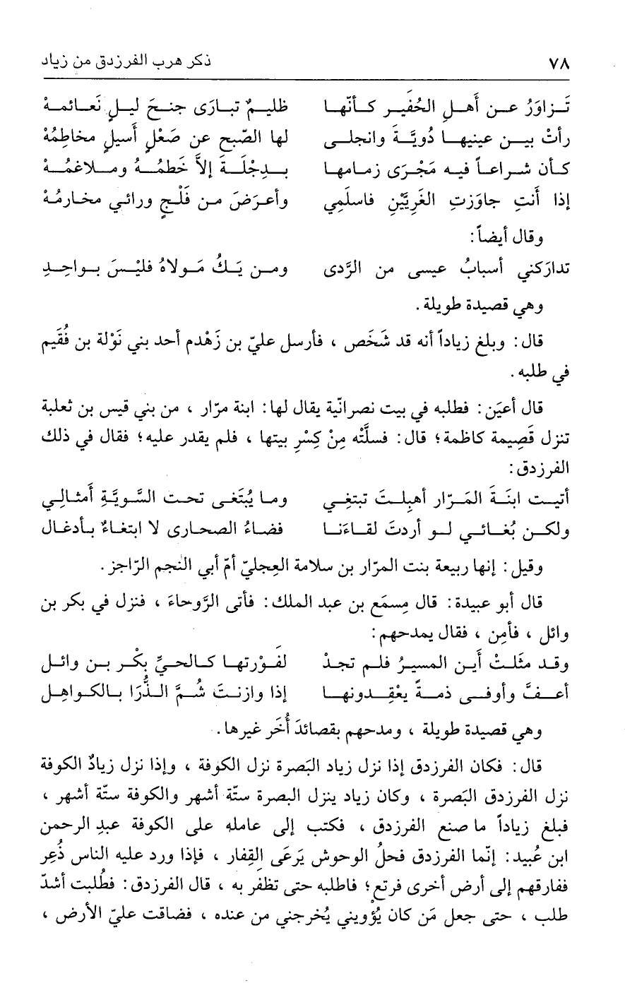 قال: فكان الفرزدق إذا نزل زياد البَصرة نزل الكوفة، وإذا نزل زيادٌ الكوفة نزل الفرزدق البَصرة، وكان زياد ينزل البصرة ستّة أشهر والكوفة ستّة أشهر، فبلغ زيادًا ما صنع الفرزدق، فكتب إلى عامله على الكوفة عبدِ الرحمن بن عُبيد: إنّما الفرزدق فحلُ الوحوش يَرعَى القِفار، فإذا ورد عليه الناس ذُعِر ففارقهم إلى أرض أخرى فرتع؛ فاطلبه حتى تظفَر به، قال الفرزدق: فطُلبت أشدّ طلب، حتى جعل مَن كان يُؤْويني يُخرجني من عنده، فضاقت عليّ الأرض،