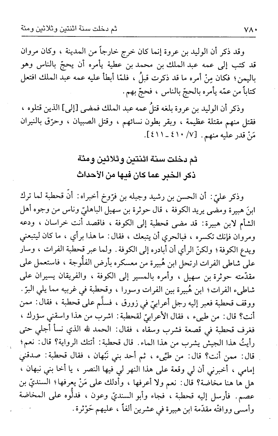 وذكر أن الوليد بن عروة بلغه قتلُ عمه عبد الملك فمضى [إلى] الذين قتلوه، فقتل منهم مقتلة عظيمة، وبقر بطون نسائهم، وقتل الصبيان، وحرّق بالنيران مَنْ قدر عليه منهم. [٧/ ٤١٠ - ٤١١].