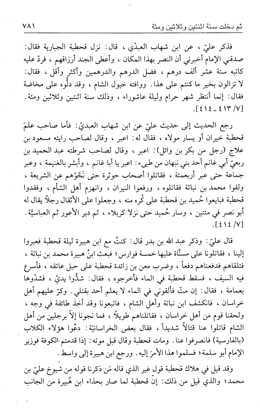 فذكر عليّ، عن ابن شهاب العبدّي، قال: نزل قحطبة الجبارية فقال: صدقني الإمام أخبرني أن النصر بهذا المكان، وأعطى الجند أرزاقهم، فردّ عليه كاتبه ستة عشر ألف درهم، فضل الدرهم والدرهمين وأكثر وأقل، فقال: لا تزالون بخير ما كنتم على هذا. ووافته خيول الشام، وقد دلُّوه على مخاضة فقال: إنما أنتظر شهر حرام وليلة عاشوراء، وذلك سنة اثنتين وثلاثين ومئة. [٧/ ٤١٣ - ٤١٤].