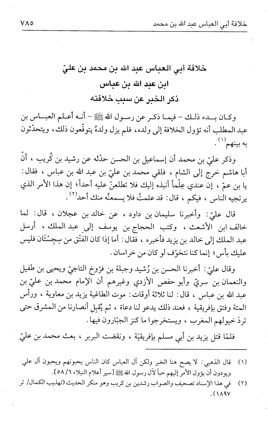 (١) قال الذهبي: لا يصح هنا الخبر ولكن آل العباس كان الت س يحبونهم ويحبون آل علي ويودون أن يؤول الأمر إليهم حبًّا لآل رسول الله - صلى الله عليه وسلم - أسير أعلام النبلاء ٦/ ٥٨].