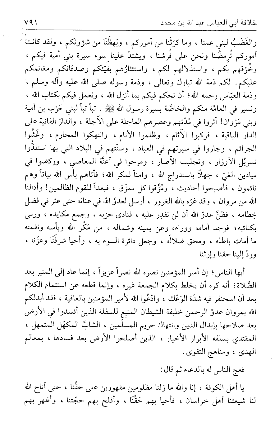 والغَضَبُ لبني عمنا، وما كرَثَنا من أموركم، وبَهظَنَا من شؤونكم، ولقد كانت أموركم تُرِمضُنا ونحن على فُرشنا، ويشتدّ علينا سوء سيرة بني أمية فيكم، وخُرْقهم بكم، واستذلالهم لكم، واستئثارُهم بفَيْئكم وصدقاتكم ومغانمكم عليكم. لكم ذمة الله تبارك وتعالى، وذمة رسوله صلى الله عليه وآله وسلم، وذمة العبّاس رحمه الله؛ أن نحكم فيكم بما أنزل الله، ونعمل فيكم بكتاب الله، ونسير في العامَّة منكم والخاصَّة بسيرة رسول الله - صلى الله عليه وسلم -. تبًا تبًا لبني حَرْب بن أمية وبني مَرْوان! آثروا في مُدّتهم وعصرهم العاجلة على الآجلة، والدارَ الفانية على الدار الباقية، فركبوا الآثام، وظلموا الأنام، وانتهكوا المحارم، وغَشُوا الجرائم، وجاروا في سيرتهم في العباد، وسنّتهم في البلاد التي بها استلذُّوا تسربُل الأوزار، وتجلبب الآصار، ومرحوا في أعنَّة المعاصي، وركضوا في ميادين الغيّ، جهلًا باستدراج الله، وأمنًا لمكر الله؛ فأتاهم بأس الله بياتًا وهم نائمون، فأصبحوا أحاديث، ومُزِّقوا كل ممزّق، فبعدًا للقوم الظالمين! وأدالنا الله من مروان، وقد غرّه بالله الغرور، أرسل لعدوِّ الله في عنانه حتى عثر في فضل خِطامه، فظنَّ عدوّ الله أن لن نقدِر عليه، فنادى حزبه، وجمع مكايده، ورمى بكتائبه؛ فوجد أمامه ووراءه وعن يمينه وشماله، من مَكْر الله وبأسه ونقمته ما أمات باطله، ومحق ضلالَه، وجعل دائرة السوء به، وأحيا شرفَنَا وعزّنا، وردّ إلينا حقنا وإرثنا.