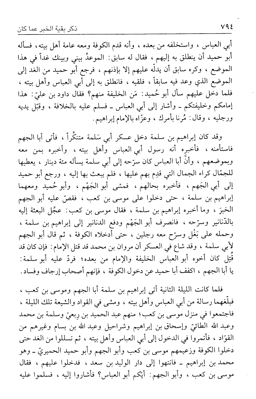 أبي العباس، واستخلفه من بعده، وأنه قدم الكوفة ومعه عامة أهل بيته، فسأله أبو حميد أن ينطلق به إليهم، فقال له سابق: الموعدُ بيني وبينك غدًا في هذا الموضع، وكره سابق أن يدلّه عليهم إلا بإذنهم، فرجع أبو حميد من الغد إلى الموضع الذي وعد فيه سابقًا، فلقيه، فانطلق به إلى أبي العباس وأهل بيته، فلما دخل عليهم سأل أبو حُميد: مَن الخليفة منهم؟ فقال داود بن عليّ: هذا إمامكم وخليفتكم - وأشار إلى أبي العباس - فسلم عليه بالخلافة، وقبّل يديه ورجليه، وقال: مُرنا بأمرك، وعزّاه بالإمام إبراهيم.