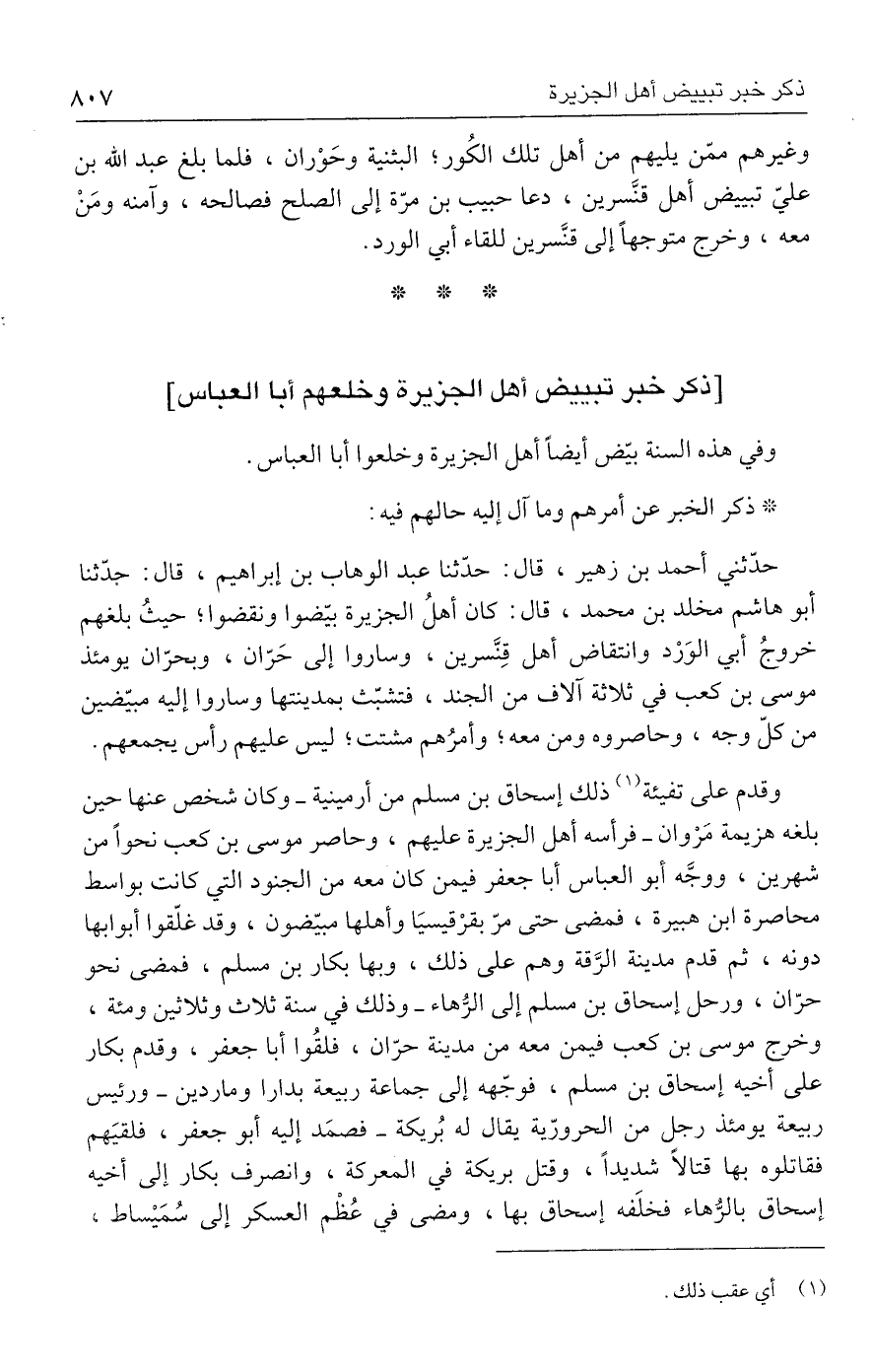 حدّثني أحمد بن زهير، قال: حدّثنا عبد الوهاب بن إبراهيم، قال: حدّثنا أبو هاشم مخلد بن محمد، قال: كان أهلُ الجزيرة بيّضوا ونقضوا؛ حيثُ بلغهم خروجُ أبي الوَرْد وانتقاض أهل قِنَّسرين، وساروا إلى حَرّان، وبحرّان يومئذ موسى بن كعب في ثلاثة آلاف من الجند، فتشبّث بمدينتها وساروا إليه مبيّضين من كلّ وجه، وحاصروه ومن معه؛ وأمرُهم مشتت؛ ليس عليهم رأس يجمعهم.