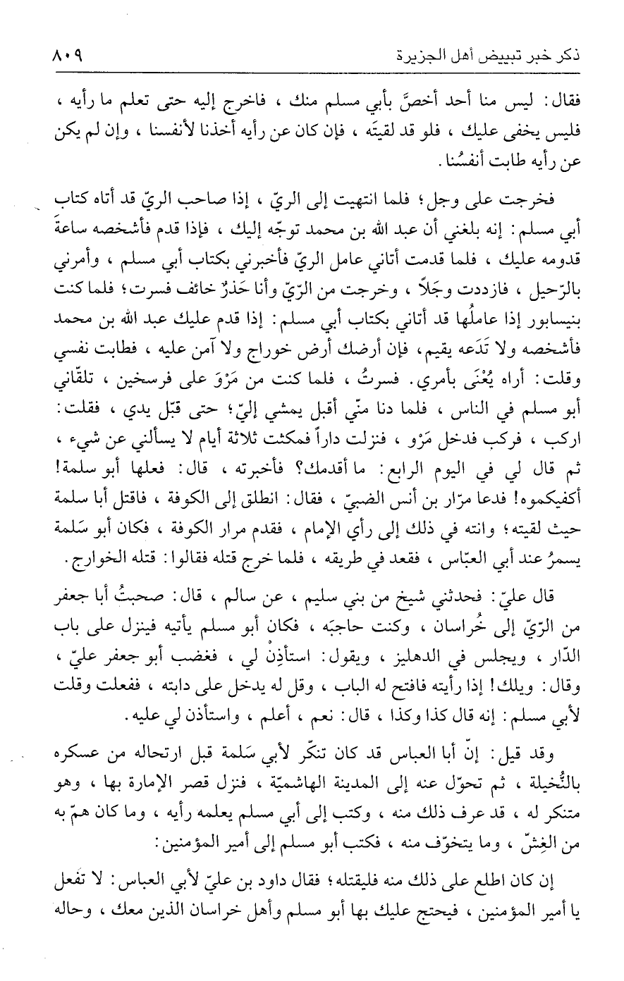 فقال: ليس منا أحد أخصَّ بأبي مسلم منك، فاخرج إليه حتى تعلم ما رأيه، فليس يخفى عليك، فلو قد لقيتَه، فإن كان عن رأيه أخذنا لأنفسنا، وإن لم يكن عن رأيه طابت أنفسُنا.