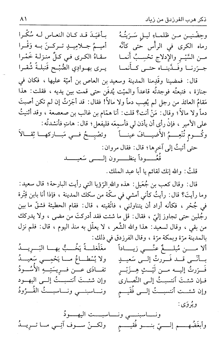 قال: فمضينا وقَدِمنا المدينة وسعيد بن العاص بن أميّه عليها، فكان في جنازة، فتبعتُه فوجدتُه قاعدًا والميّت يُدفَن حتى قمت بين يديه، فقلت: هذا مَقامُ العائذ من رجل لم يُصِب دمًا ولا مالًا! فقال: قد أجَرْتُ إن لم تكن أصبتَ دمًا ولا مالًا؛ وقال: مَنْ أنت؟ قلت: أنا همّام بن غالب بن صعصعة، وقد أثنيتُ على الأمير، فإنْ رأى أن يأذن لي فأسمِعَه فليفعل؛ قال: هاتِ فأنشدتُه:
