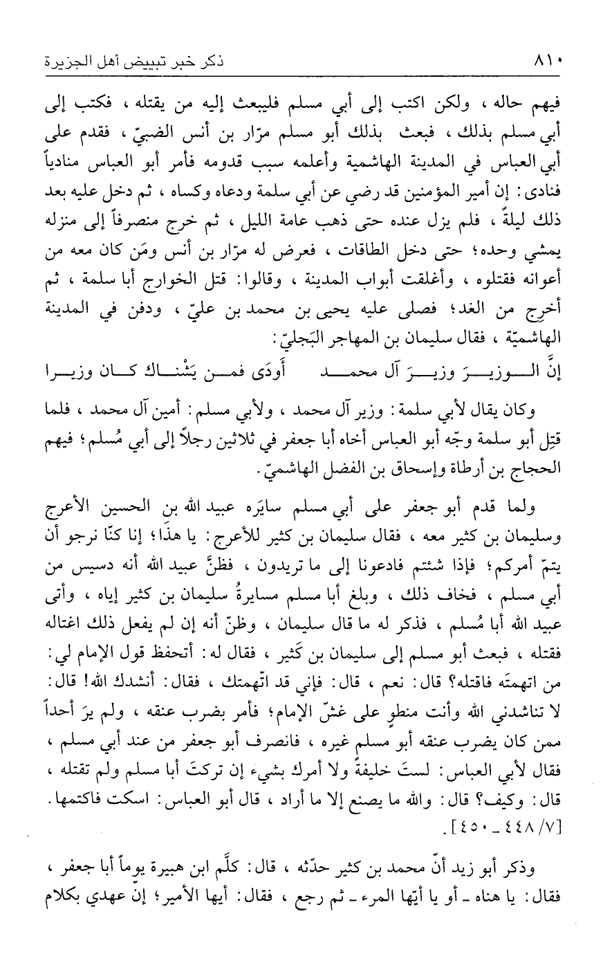 ولما قدم أبو جعفر على أبي مسلم سايَره عبيد الله بن الحسين الأعرج وسليمان بن كثير معه، فقال سليمان بن كثير للأعرج: يا هذَا؛ إنا كنّا نرجو أن يتمّ أمركم؛ فإذا شئتم فادعونا إلى ما تريدون، فظنَّ عبيد الله أنه دسيس من أبي مسلم، فخاف ذلك، وبلغ أبا مسلم مسايرةُ سليمان بن كثير إياه، وأتى عبيد الله أبا مُسلم، فذكر له ما قال سليمان، وظنّ أنه إن لم يفعل ذلك اغتاله فقتله، فبعث أبو مسلم إلى سليمان بن كَثير، فقال له: أتحفظ قول الإمام لي: من اتهمتَه فاقتله؟ قال: نعم، قال: فإني قد اتّهمتك، فقال: أنشدك الله! قال: لا تناشدني الله وأنت منطوٍ على غشّ الإمام؛ فأمر بضرب عنقه، ولم يرَ أحدًا ممن كان يضرب عنقه أبو مسلم غيره، فانصرف أبو جعفر من عند أبي مسلم، فقال لأبي العباس: لستَ خليفةً ولا أمرك بشيء إن تركتَ أبا مسلم ولم تقتله، قال: وكيف؟ قال: والله ما يصنع إلا ما أراد، قال أبو العباس: اسكت فاكتمها. [٧/ ٤٤٨ - ٤٥٠].