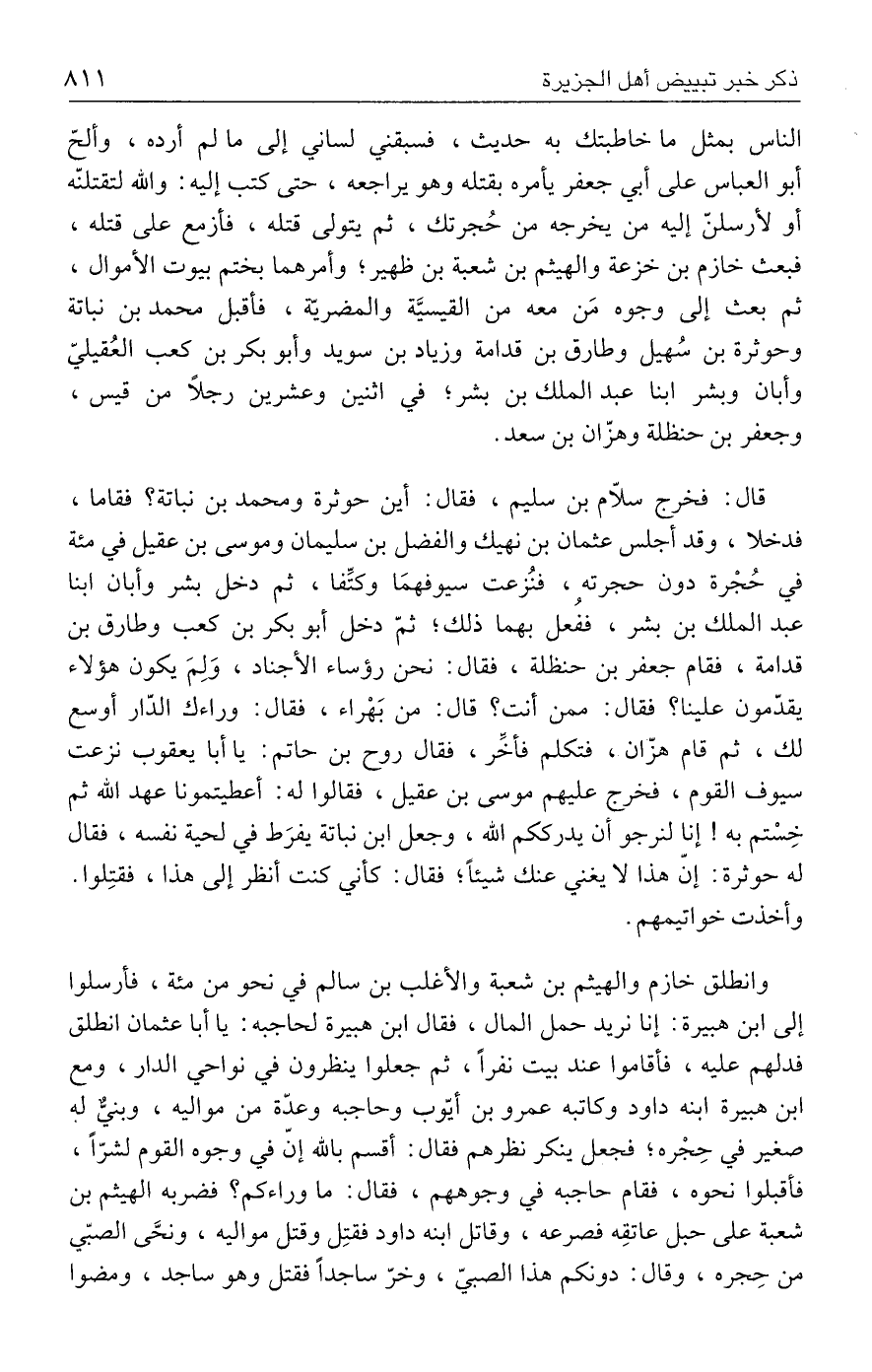 الناس بمثل ما خاطبتك به حديث، فسبقني لساني إلى ما لم أرده، وألحّ أبو العباس على أبي جعفر يأمره بقتله وهو يراجعه، حتى كتب إليه: والله لتقتلنّه أو لأرسلنّ إليه من يخرجه من حُجرتك، ثم يتولى قتله، فأزمع على قتله، فبعث خازم بن خزعة والهيثم بن شعبة بن ظهير؛ وأمرهما بختم بيوت الأموال، ثم بعث إلى وجوه مَن معه من القيسيَّة والمضريّة، فأقبل محمد بن نباتة وحوثرة بن سُهيل وطارق بن قدامة وزياد بن سويد وأبو بكر بن كعب العُقيليّ وأبان وبشر ابنا عبد الملك بن بشر؛ في اثنين وعشرين رجلًا من قيس، وجعفر بن حنظلة وهزّان بن سعد.