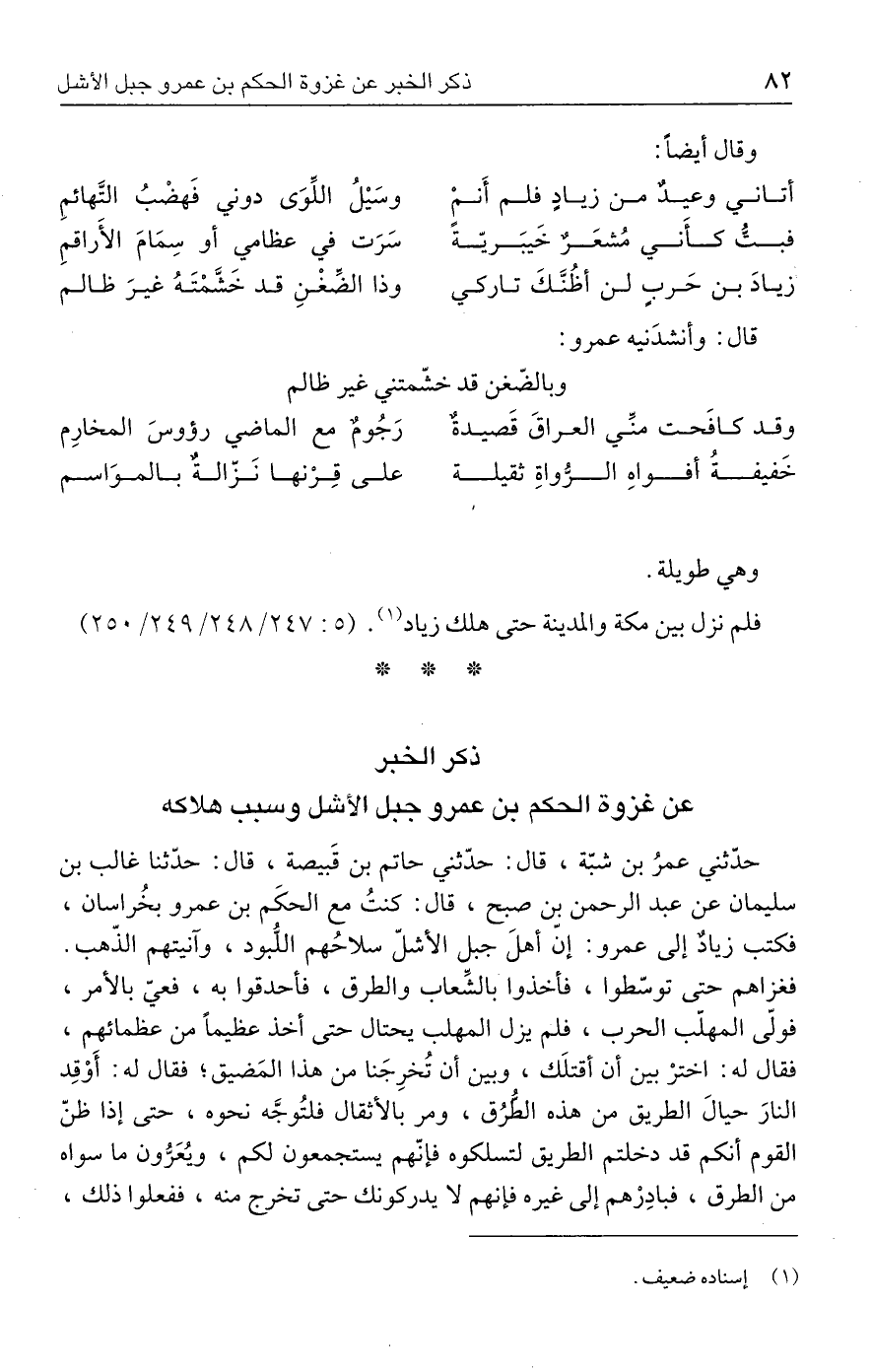 حدّثني عمرُ بن شبّة، قال: حدّثني حاتم بن قَبيصة، قال: حدّثنا غالب بن سليمان عن عبد الرحمن بن صبح، قال: كنتُ مع الحكَم بن عمرو بخُراسان، فكتب زيادٌ إلى عمرو: إنّ أهلَ جبل الأشلّ سلاحُهم اللُّبود، وآنيتهم الذّهب. فغزاهم حتى توسّطوا، فأخذوا بالشِّعاب والطرق، فأحدقوا به، فعيّ بالأمر، فولّى المهلّب الحرب، فلم يزل المهلب يحتال حتى أخذ عظيمًا من عظمائهم، فقال له: اخترْ بين أن أقتلَك، وبين أن تُخرِجَنا من هذا المَضيق؛ فقال له: أَوْقِد النارَ حيالَ الطريق من هذه الطُّرُق، ومر بالأثقال فلتُوجَّه نحوه، حتى إذا ظنّ القوم أنكم قد دخلتم الطريق لتسلكوه فإنّهم يستجمعون لكم، ويُعَرُّون ما سواه من الطرق، فبادِرْهم إلى غيره فإنهم لا يدركونك حتى تخرج منه، ففعلوا ذلك،