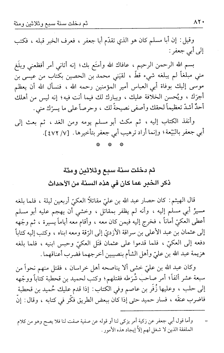 وأنفذ الكتاب إليه، ثم مكث أبو مسلم يومه ومن الغد، ثم بعث إلى أبي جعفر بالبَيْعة؛ وإنما أراد ترهيب أبي جعفر بتأخيرها. [٧/ ٤٧٢].