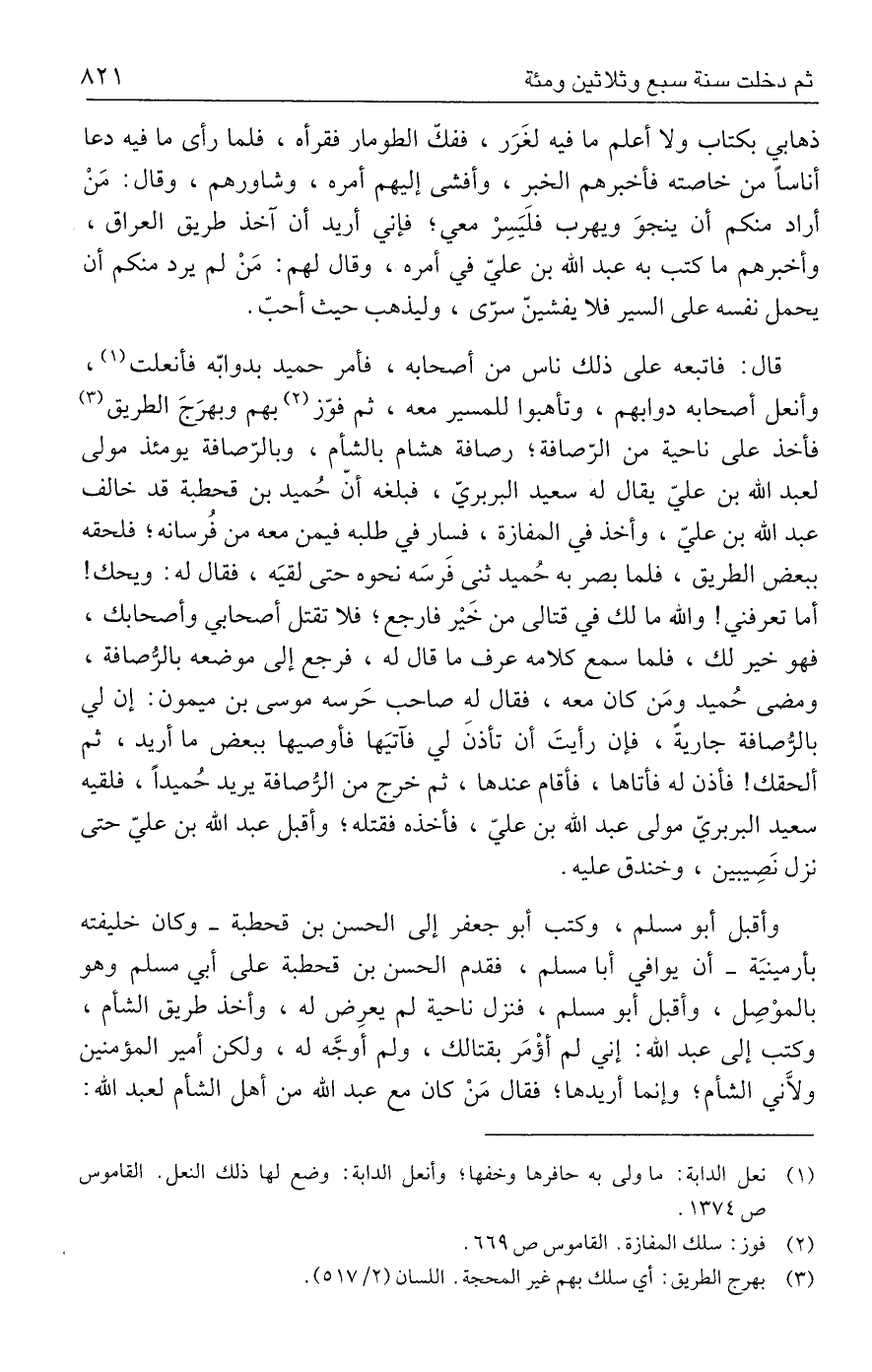 قال: فاتبعه على ذلك ناس من أصحابه، فأمر حميد بدوابّه فأنعلت (١)، وأنعل أصحابه دوابهم، وتأهبوا للمسير معه، ثم فوّز (٢) بهم وبهرَجَ الطريق (٣) فأخذ على ناحية من الرّصافة؛ رصافة هشام بالشأم، وبالرّصافة يومئذ مولى لعبد الله بن عليّ يقال له سعيد البربريّ، فبلغه أنّ حُميد بن قحطبة قد خالف عبد الله بن عليّ، وأخذ في المفازة، فسار في طلبه فيمن معه من فُرسانه؛ فلحقه ببعض الطريق، فلما بصر به حُميد ثنى فَرسَه نحوه حتى لقيَه، فقال له: ويحك! أما تعرفني! والله ما لك في قتالي من خيْر فارجع؛ فلا تقتل أصحابي وأصحابك، فهو خير لك، فلما سمع كلامه عرف ما قال له، فرجع إلى موضعه بالرُّصافة، ومضى حُميد ومَن كان معه، فقال له صاحب حَرسه موسى بن ميمون: إن لي بالرُّصافة جاريةً، فإن رأيتَ أن تأذنَ لي فآتيَها فأوصيها ببعض ما أريد، ثم ألحقك! فأذن له فأتاها، فأقام عندها، ثم خرج من الرُّصافة يريد حُميدًا، فلقيه سعيد البربريّ مولى عبد الله بن عليّ، فأخذه فقتله، وأقبل عبد الله بن عليّ حتى نزل نَصِيبين، وخندق عليه.