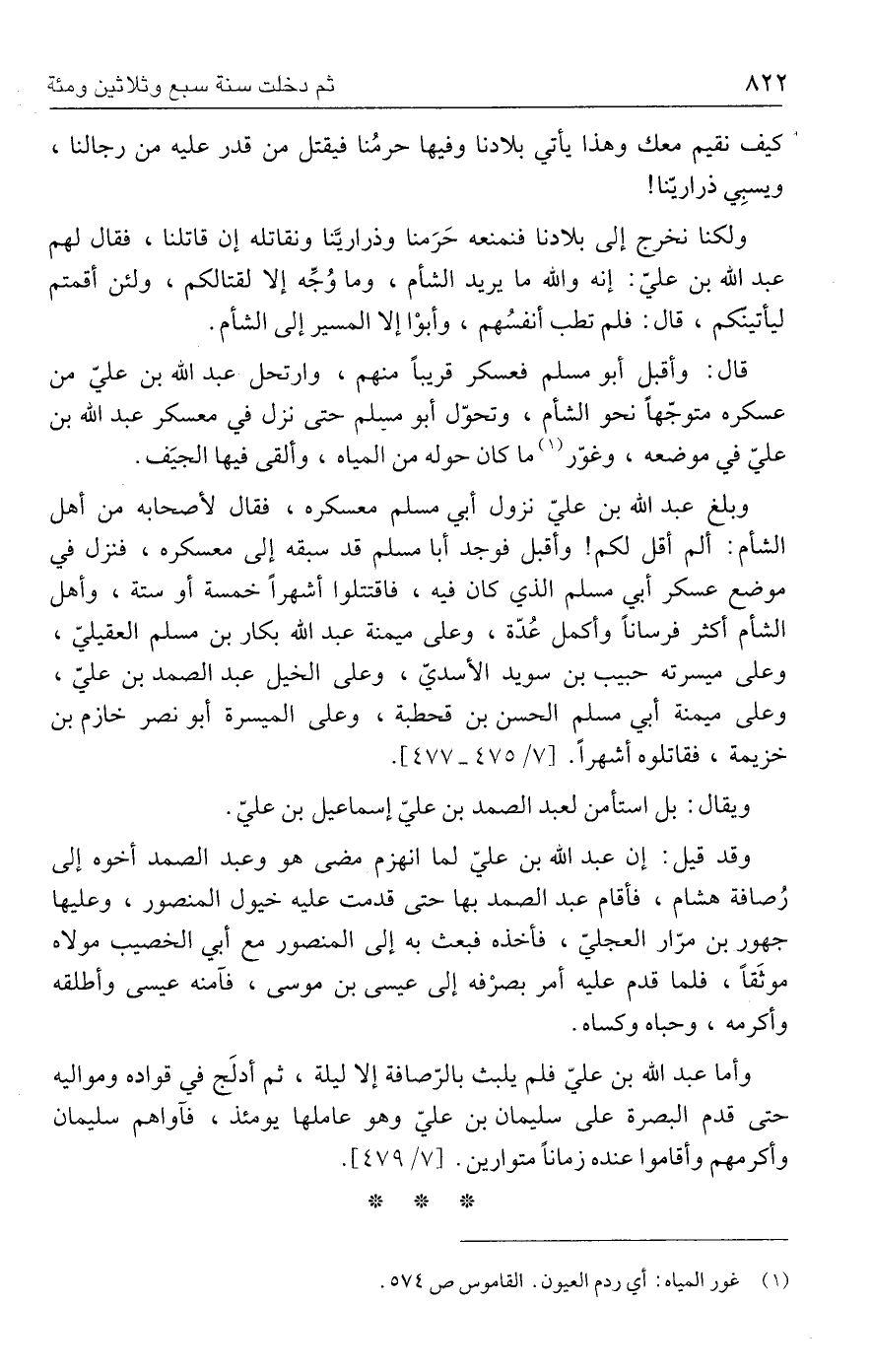وأما عبد الله بن عليّ فلم يلبث بالرّصافة إلا ليلة، ثم أدلَج في قواده ومواليه حتى قدم البصرة على سليمان بن عليّ وهو عاملها يومئذ، فآواهم سليمان وأكرمهم وأقاموا عنده زمانًا متوارين. [٧/ ٤٧٩].
