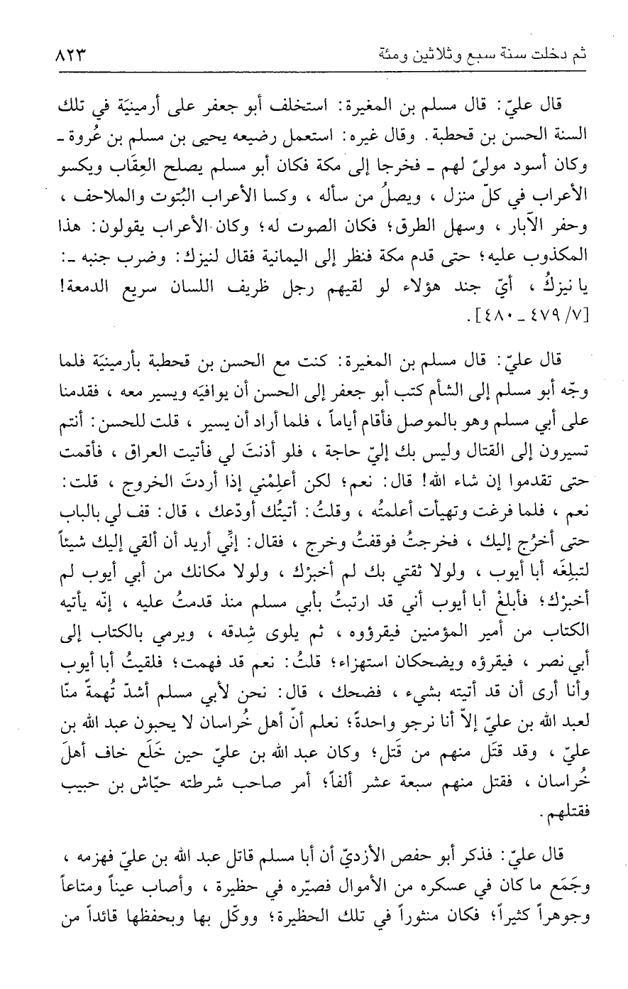 قال عليّ: قال مسلم بن المغيرة: كنت مع الحسن بن قحطبة بأرمينيَة فلما وجّه أبو مسلم إلى الشأم كتب أبو جعفر إلى الحسن أن يوافيَه ويسير معه، فقدمنا على أبي مسلم وهو بالموصل فأقام أيامًا، فلما أراد أن يسير، قلت للحسن: أنتم تسيرون إلى القتال وليس بك إليّ حاجة، فلو أذنتَ لي فأتيت العراق، فأقمت حتى تقدموا إن شاء الله! قال: نعم؛ لكن أعلِمْني إذا أردتَ الخروج، قلت: نعم، فلما فرغت وتهيأت أعلمتُه، وقلتُ: أتيتُك أودّعك، قال: قف لي بالباب حتى أخرُج إليك، فخرجتُ فوقفتُ وخرج، فقال: إنَي أريد أن ألقي إليك شيئًا لتبلِغَه أبا أيوب، ولولا ثقتي بك لم أخبرْك، ولولا مكانك من آلجي أيوب لم أخبرْك، فأبلغْ أبا أيوب أني قد ارتبتُ بأبي مسلم منذ قدمتُ عليه، إنه يأتيه الكتاب من أمير المؤمنين فيقرؤوه، ثم يلوى شِدقه، ويرمي بالكتاب إلى أبي نصر، فيقرؤه ويضحكان استهزاء؛ قلتُ: نعم قد فهصت، فلقيتُ أبا أيوب وأنا أرى أن قد أتيته بشيء، فضحك، قال: نحن لأبي مسلم أشدّ تُهمةً منّا لعبد الله بن عليّ إلّا أنا نرجو واحدةً، نعلم أنّ أهل خُراسان لا يحبون عبد الله بن عليّ، وقد قتَل منهم من قَتل، وكان عبد الله بن عليّ حين خَلَع خاف أهلَ خُراسان، فقتل منهم سبعة عشر ألفًا؛ أمر صاحب شرطته حيّاش بن حبيب فقتلهم.