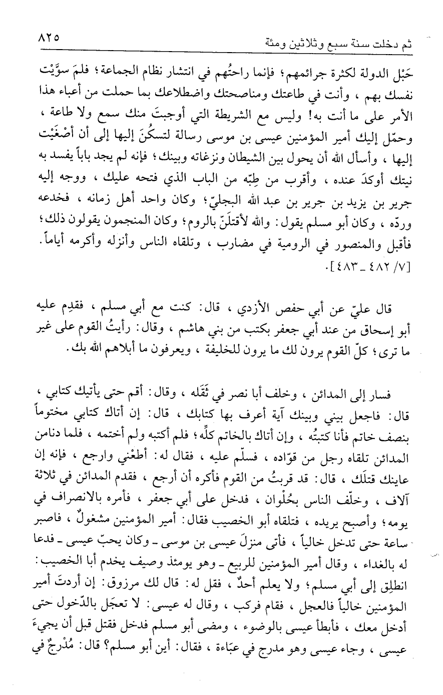 حَبْل الدولة لكثرة جرائمهم؛ فإنما راحتُهم في انتشار نظام الجماعة؛ فلمَ سوَّيْت نفسك بهم، وأنت في طاعتك ومناصحتك واضطلاعك بما حملت من أعباء هذا الأمر على ما أنت به! وليس مع الشريطة التي أوجبتَ منك سمع ولا طاعة، وحمّل إليك أمير المؤمنين عيسى بن موسى رسالة لتسكُنَ إليها إلى أن أصغَيْت إليها، وأسأل الله أن يحول بين الشيطان ونزغاته وبينك؛ فإنه لم يجد بابًا يفسد به نيتك أوكدَ عنده، وأقرب من طِبّه من الباب الذي فتحه عليك، ووجه إليه جرير بن يزيد بن جرير بن عبد الله البجليّ؛ وكان واحد أهل زمانه، فخدعه وردّه، وكان أبو مسلم يقول: والله لأقتلَنّ بالروم، وكان المنجمون يقولون ذلك؛ فأقبل والمنصور في الرومية في مضارب، وتلقاه الناس وأنزله وأكرمه أيامًا. [٧/ ٤٨٣ - ٤٨٢].