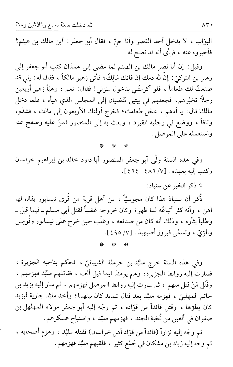 وقيل: إن أبا نصر مالك بن الهيثم لما مضى إلى همذان كتب أبو جعفر إلى زهير بن التركيّ: إنّ لله دمك إن فاتك مَالِكٌ؛ فأتى زهير مالكًا، فقال له: إني قد صنعتُ لك طعامًا، فلو أكرمتَني بدخول منزلي! فقال: نعم، وهيّأ زهير أربعين رجلًا تخيَّرهم، فجعلهم في بيتين يُفضيان إلى المجلس الذي هيأه، فلما دخل مالك قال: يا أدهم، عجّل طعامك؛ فخرج أولئك الأربعون إلى مالك، فشدّوه وثاقًا، ووضع في رجليه القيود، وبعث به إلى المنصور فمنّ عليه وصفح عنه واستعمله على الموصل.