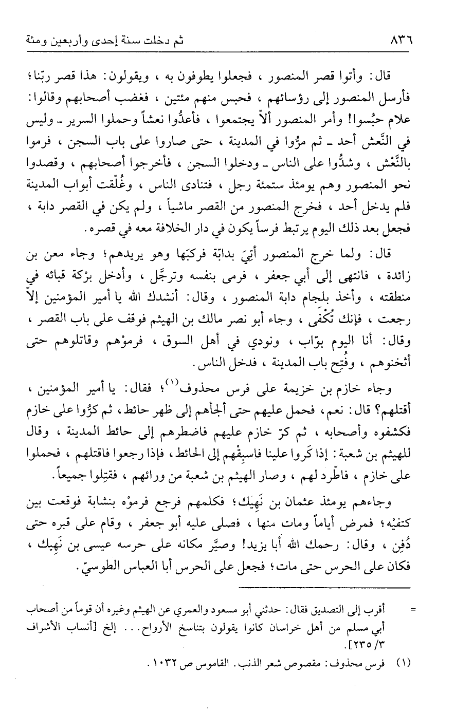 وجاءهم يومئذ عثمان بن نَهِيك؛ فكلمهم فرجع فرموْه بنشابة فوقعت بين كتفيْه؛ فمرض أيامًا ومات منها، فصلى عليه أبو جعفر، وقام على قبره حتى دُفِن، وقال: رحمك الله أبا يزيد! وصيَّر مكانه صلى حرسه عيسى بن نَهِيك، فكان على الحرس حتى مات؛ فجعل على الحرس أبا العباس الطوسيّ.