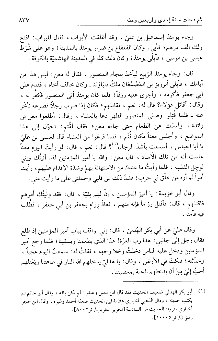 وجاء يومئذ إسماعيل بن عليّ، وقد أغلقت الأبواب، فقال للبواب: افتح ولك ألف درهم؛ فأبى. وكان القعقاع بن ضرار يومئذ بالمدينة؛ وهو على شُرَط عيسى بن موسى، فأبلَى يومئذ؛ وكان ذلك كله في المدينة الهاشميّة بالكوفة.