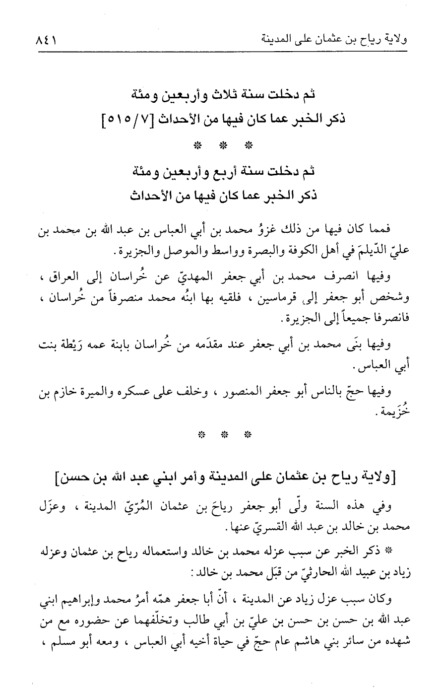 ثم دخلت سنة ثلاث وأربعين ومئة ذكر الخبر عما كان فيها من الأحداث [٧/ ٥١٥]