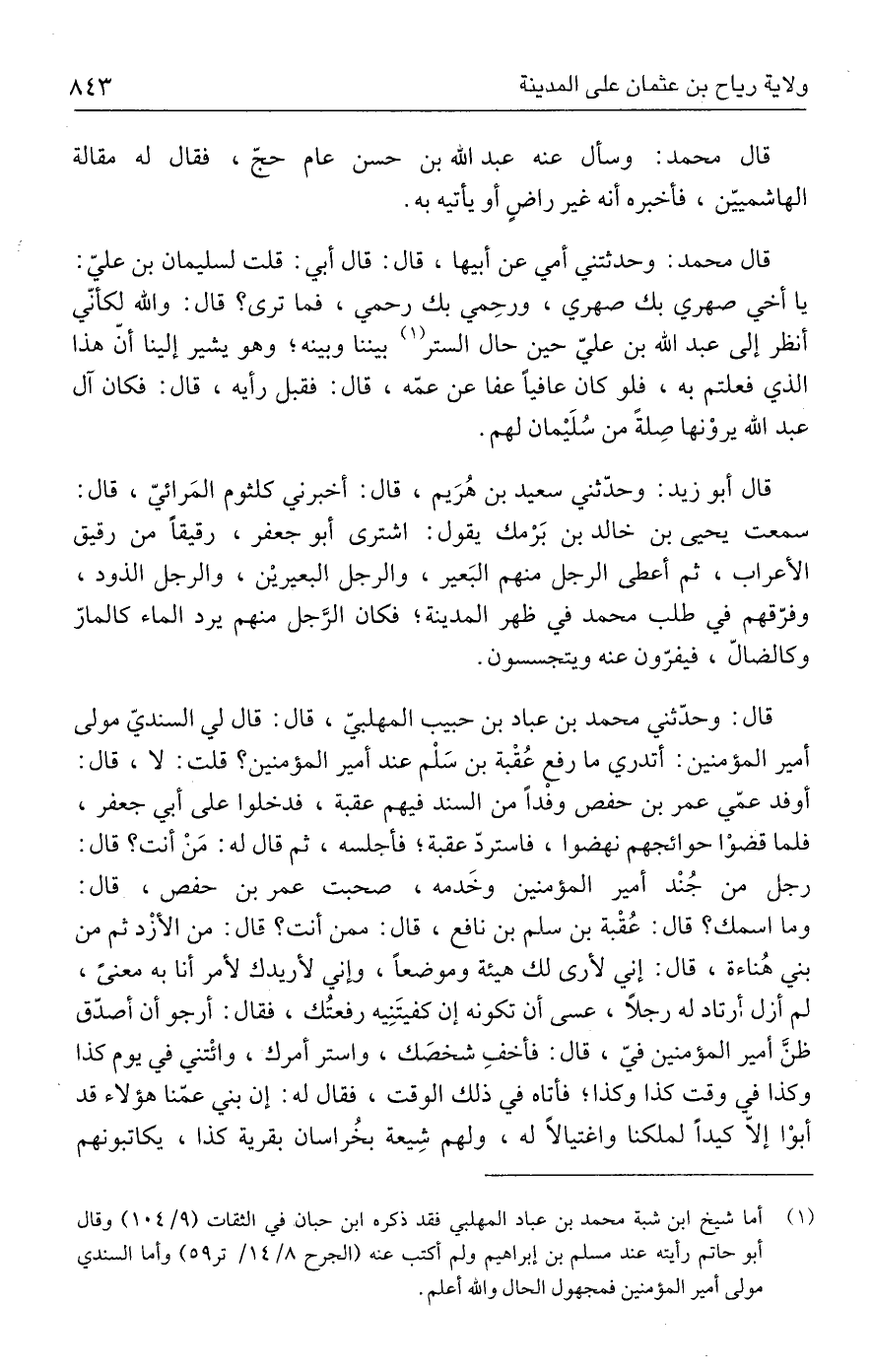 (١) أما شيخ ابن شبة محمد بن عباد المهلبي فقد ذكره ابن حبان في الثقات (٩/ ١٠٤) وقال أبو حاتم رأيته عند مسلم بن إبراهيم ولم أكتب عنه (الجرح ٨/ ١٤/ تر ٥٩) وأما السندي مولى أمير المؤمنين فمجهول الحال والله أعلم.