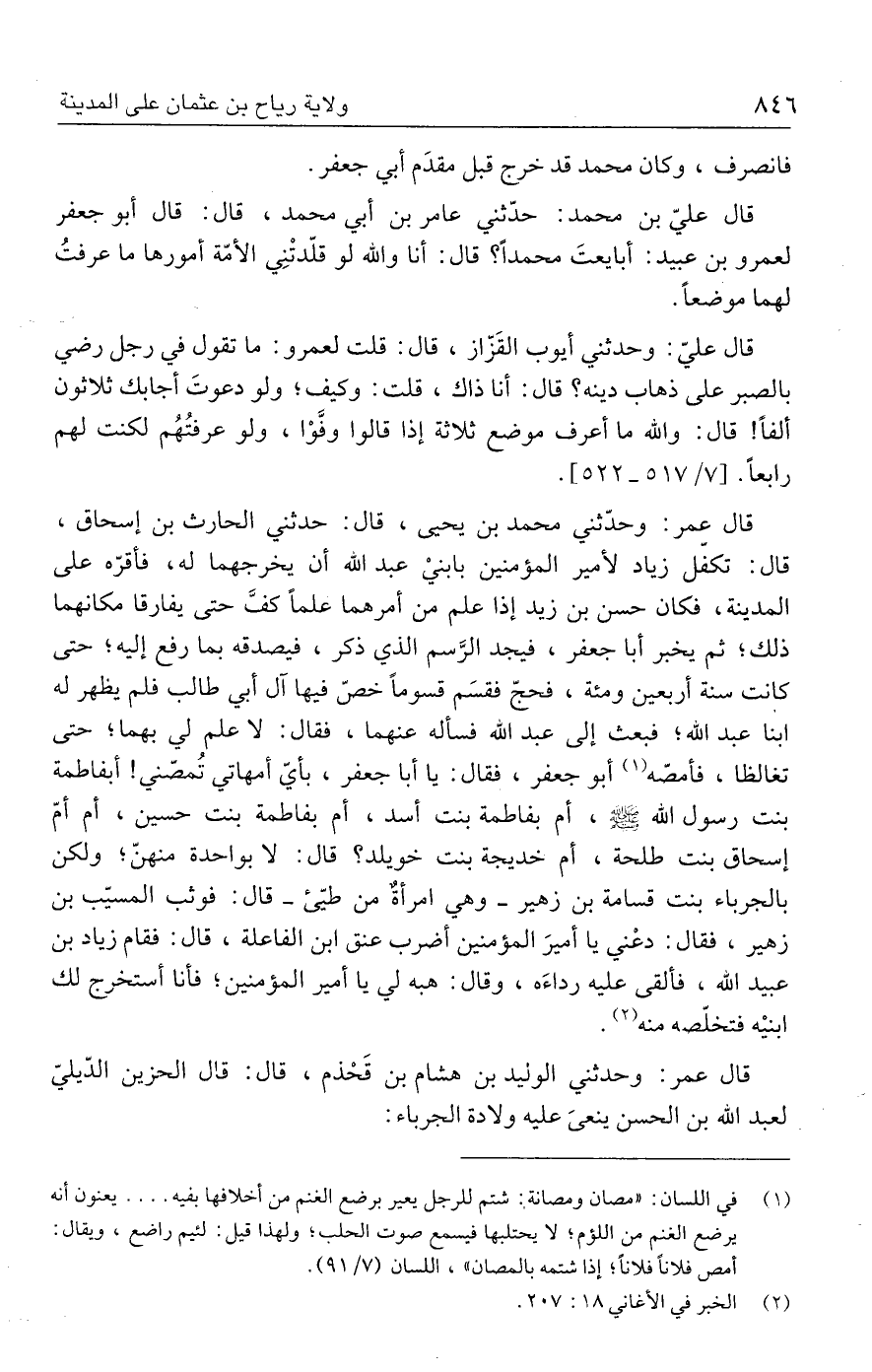 قال عمر: وحدّثني محمد بن يحيى، قال: حدثني الحارث بن إسحاق، قال: تكفّل زياد لأمير المؤمنين بابنيْ عبد الله أن يخرجهما له، فأقرّه على المدينة، فكان حسن بن زيد إذا علم من أمرهما علمًا كفَّ حتى يفارقا مكانهما ذلك؛ ثم يخبر أبا جعفر، فيجد الرَّسم الذي ذكر، فيصدقه بما رفع إليه؛ حتى كانت سنة أربعين ومئة، فحجّ فقسَم قسومًا خصّ فيها آل أبي طالب فلم يظهر له ابنا عبد الله؛ فبعث إلى عبد الله فسأله عنهما، فقال: لا علم لي بهما؛ حتى تغالظا، فأمصّه (١) أبو جعفر، فقال: يا أبا جعفر، بأيّ أمهاتي تُمصّني! أبفاطمة بنت رسول الله - صلى الله عليه وسلم -، أم بفاطمة بنت أسد، أم بفاطمة بنت حسين، أم أمّ إسحاق بنت طلحة، أم خديجة بنت خويلد؟ قال: لا بواحدة منهنّ؛ ولكن بالجرباء بنت قسامة بن زهير - وهي امرأةٌ من طيّئ - قال: فوثب المسيّب بن زهير، فقال: دعْني يا أميرَ المؤمنين أضرب عنق ابن الفاعلة، قال: فقام زياد بن عبيد الله، فألقى عليه رداءَه، وقال: هبه لي يا أمير المؤمنين؛ فأنا أستخرج لك ابنيْه فتخلّصه منه (٢).