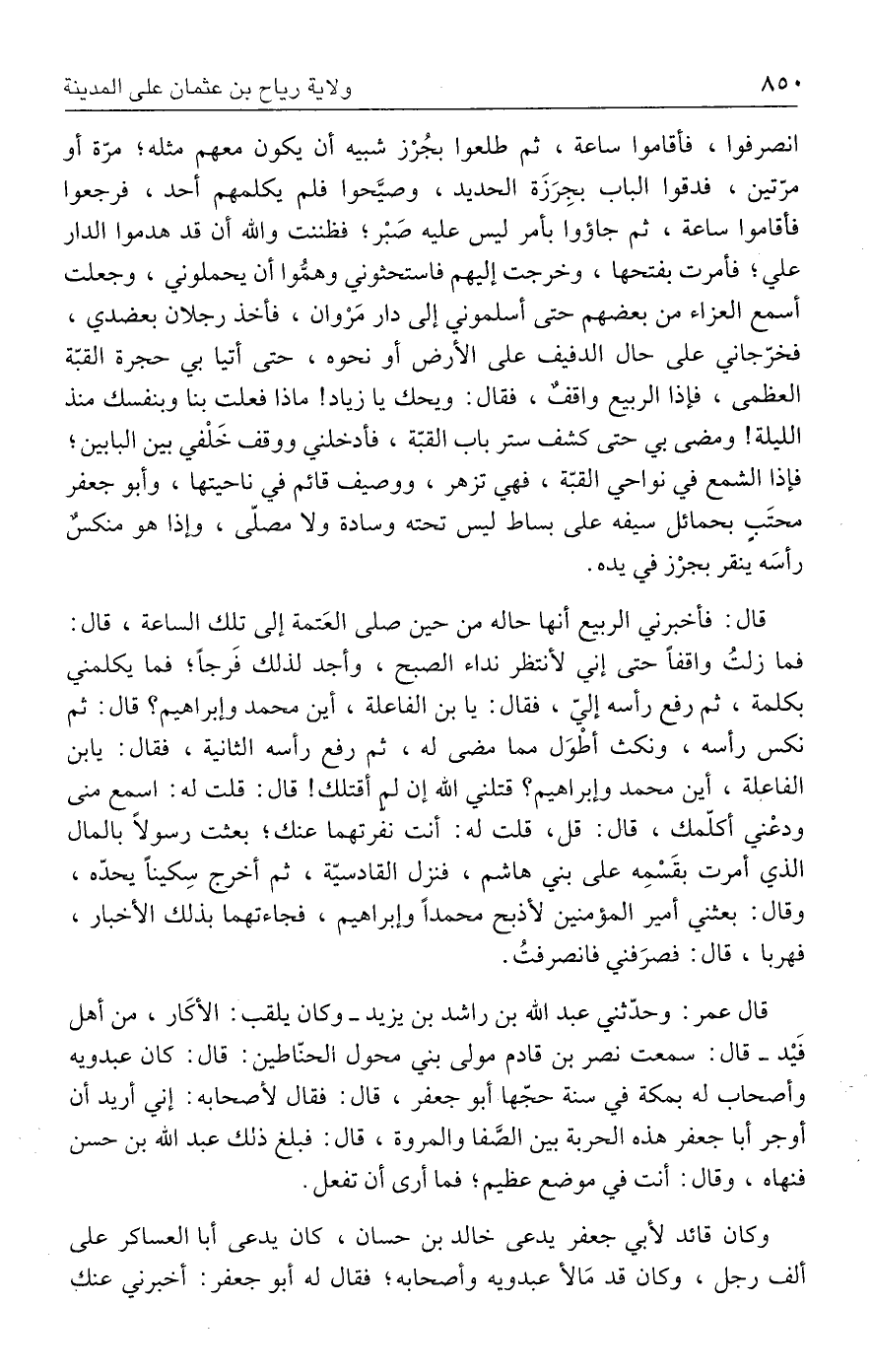 قال: فأخبرني الربيع أنها حاله من حين صلى العَتمة إلى تلك الساعة، قال: فما زلتُ واقفًا حتى إني لأنتظر نداء الصبح، وأجد لذلك فَرجًا؛ فما يكلمني بكلمة، ثم رفع رأسه إليّ، فقال: يا بن الفاعلة، أين محمد وإبراهيم؟ قال: ثم نكس رأسه، ونكث أطْوَل مما مضى له، ثم رفع رأسه الثانية، فقال: يابن الفاعلة، أين محمد وإبراهيم؟ قتلني الله إن لم أقتلك! قال: قلت له: اسمع مني ودعْني أكلّمك، قال: قل، قلت له: أنت نفرتهما عنك؛ بعثت رسولًا بالمال الذي أمرت بقَسْمِه عليّ بني هاشم، فنزل القادسيّة، ثم أخرج سِكينًا يحدّه، وقال: بعثني أمير المؤمنين لأذبح محمدًا وإبراهيم، فجاءتهما بذلك الأخبار، فهربا، قال: فصرَفني فانصرفتُ.