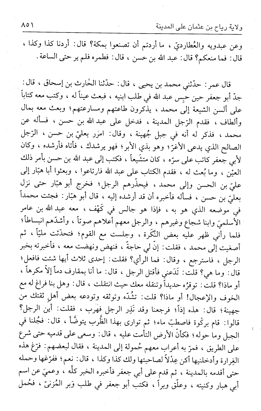 قال عمر: حدّثني محمد بن يحيى، قال: حدّثنا الحارث بن إسحاق، قال: جدّ أبو جعفر حين حبِس عبد الله في طلب ابنيه، فبعث عينًا له، وكتب معه كتابًا على ألسن الشيعة إلى محمد، يذكرون طاعتهم ومسارعتهم؛ وبعث معه بمال وألطاف، فقدم الرّجل المدينة، فدخل على عبد الله بن حسن، فسأله عن محمد، فذكر له أنه في جبل جُهينة، وقال: امرر بعليّ بن حسن، الرّجل الصالح الذي يدعى الأغرّ، وهو بذي الأبر، فهو يرشدك، فأتاه فأرشده، وكان لأبي جعفر كاتب على سرّه، كان متشَيعًا، فكتب إلى عبد الله بن حسن بأمر ذلك العيْن، وما بُعث له، فقدم الكتاب على عبد الله فارتاعوا، وبعتوا أبا هبّار إلى عليّ بن الحسن وإلى محمد، فيحذرهم الرجل؛ فخرج أبو هبّار حتى نزل بعليّ بن حسن، فسأله فأخبره أن قد أرشده إليه، قال أبو هبّار: فجئت محمدًا في موضعه الذي هو به، فإذا هو جالس في كَهْف، معه عبد الله بن عامر الأسلميَ وابنا شجاع وغيرهم، والرجل معهم أعلاهم صوتًا، وأشدّهم انبساطًا؛ فلما رأني ظهر عليه بعض النَّكَرة، وجلست مع القوم؛ فتحدّثت مليًّا، ثم أصغيت إلى محمد، فقلت: إنّ لي حاجةً، فنهض ونهضت معه، فأخبرته بخبر الرجل، فاسترجع، وقال: فما الرأي؟ فقلت: إحدى ثلاث أيها شئت فافعل؛ قال: وما هي؟ قلت: تَدَعني فأقتل الرجل، قال: ما أنا بمقارف دمًا إلّا مكرهًا، أو ماذا؟ قلت: توقرُه حديدًا وتنقله معك حيث انتقلت، قال: وهل بنا فراغ له مع الخوف والإعجال! أو ماذا؟ قلت: تشُدّه وتوثقه وتودعه بعض أهلِ ثقتك من جهينة؛ قال: هذه إذًا؛ فرجعنا وقد نَذِر الرجل فهرب، فقلت: أين الرجل؟ قالوا: قام بركْوة فاصطبّ ماء؛ ثم توارى بهذا الظَّرب يتوضَّأ، قال: فجُلنا في الجبل وما حوله؛ فكأنّ الأرض التأمت عليه، قال: وسعى على قدميه حتى شرع على الطريق، فمرّ به أعراب معهم حُمولة إلى المدينة، فقال لبعضهم: فرّغ هذه الغِرارة وأدخلنيها أكن عِدْلًا لصاحبتها ولك كذا وكذا، قال: نعم، ففرّغها وحمله حتى أقدمه بالمدينة، ثم قدم على أبي جعفر فأخبره الخبر كلَّه، وعميَ عن اسم أبي هبار وكنيته، وعلّق وبرًا، فكتب أبو جعفر في طلب وَبر المُزنيّ، فحُمل