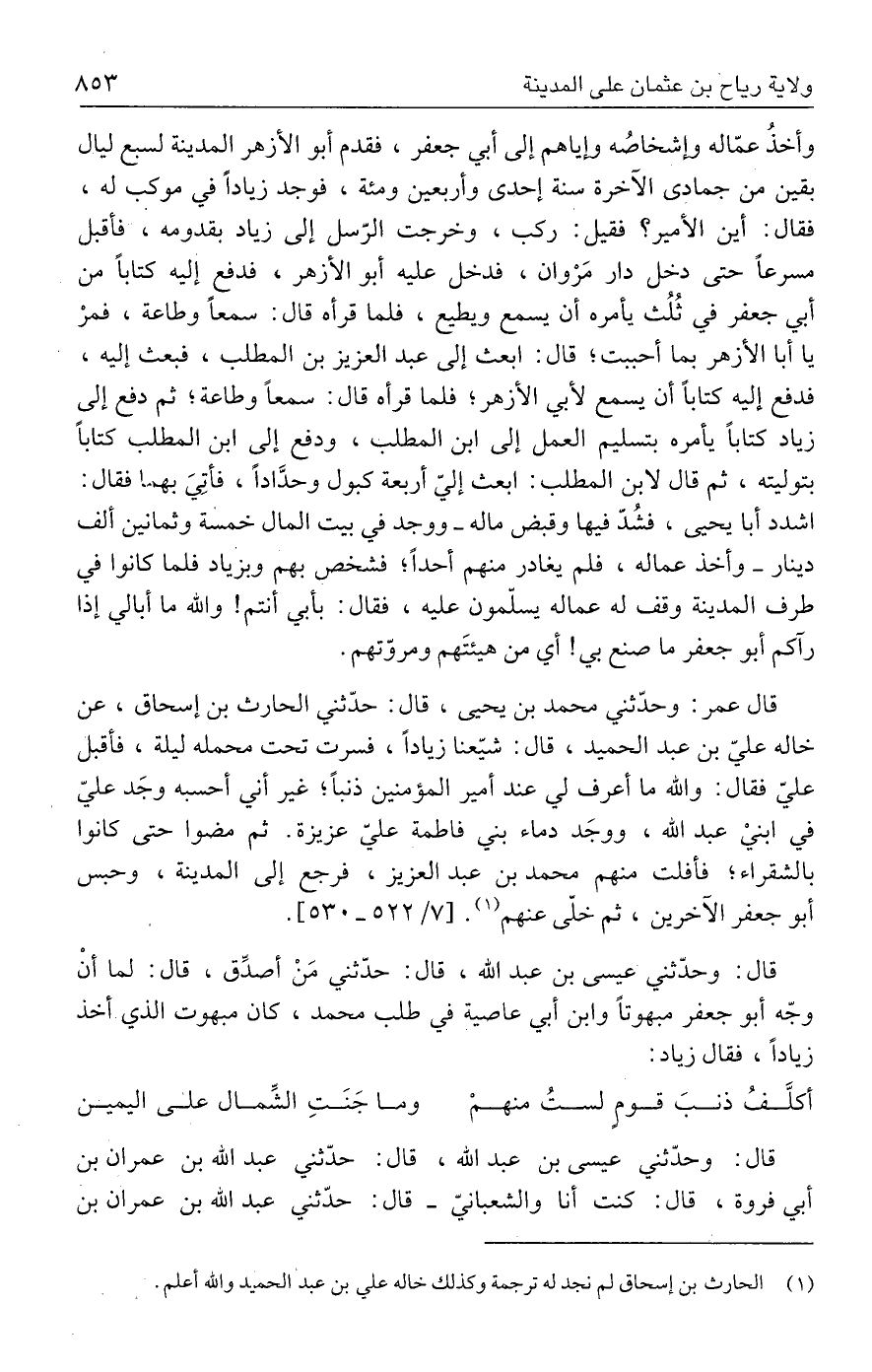 قال عمر: وحدّثني محمد بن يحيى، قال: حدّثني الحارث بن إسحاق، عن خاله عليّ بن عبد الحميد، قال: شيّعنا زيادًا، فسرت تحت محمله ليلة، فأقبل عليّ فقال: والله ما أعرف لي عند أمير المؤمنين ذنبًا؛ غير أني أحسبه وجَد عليّ في ابنيْ عبد الله، ووجَد دماء بني فاطمة عليّ عزيزة. ثم مضوا حتى كانوا بالشقراء؛ فأفلت منهم محمد بن عبد العزيز، فرجع إلى المدينة، وحبس أبو جعفر الآخرين، ثم خلّى عنهم (١) [٧/ ٥٢٢ - ٥٣٠].