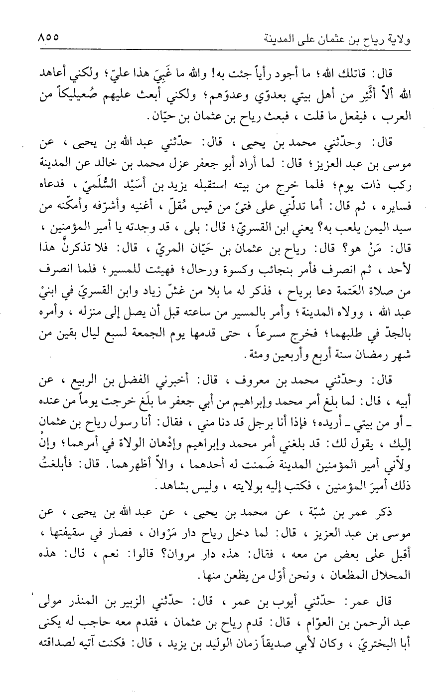 قال: وحدَّثني محمد بن معروف، قال: أخبرني الفضل بن الربيع، عن أبيه، قال: لما بلغ أمر محمد وإبراهيم من أبي جعفر ما بلَغ خرجت يومًا من عنده - أو من بيتي - أريده، فإذا أنا برجل قد دنا مني، فقال: أنا رسول رياح بن عثمان إليك، يقول لك: قد بلغني أمر سحمد وإبراهيم وإدْهان الولاة في أمرهما؛ وإنْ ولّاني أمير المؤمنين المدينة ضمنت له أحدهما، وإلّا أظه رهما. قال: فأبلغتُ ذلك أميرَ المؤمنين، فكتب إليه بولايته، وليس بشاهد.