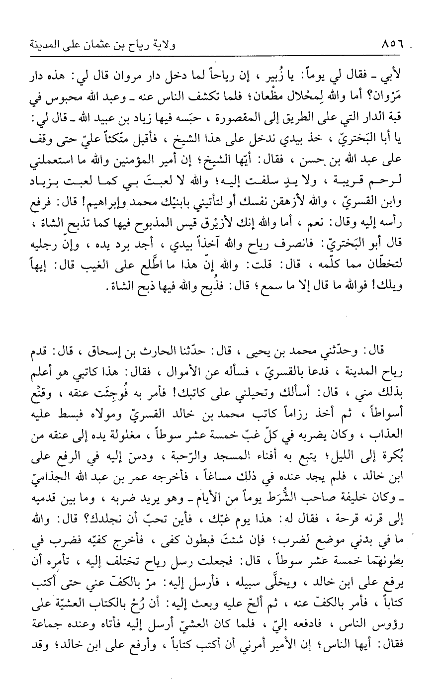 قال: وحدّثني محمد بن يحيى، قال: حدّثنا الحارث بن إسحاق، قال: قدم رياح المدينة، فدعا بالقسريّ، فسأله عن الأموال، فقال: هذا كاتبي هو أعلم بذلك مني، قال: أسألك وتحيلني على كاتبك! فأمر به فُوجِئَت عنقه، وقنِّع أسواطًا، ثم أخذ رزامًا كاتب محمد بن خالد القسريّ ومولاه فبسط عليه العذاب، وكان يضربه في كلّ غبّ خمسة عشر سوطًا، مغلولة يده إلى عنقه من بُكرة إلى الليل؛ يتجع به أفناء المسجد والرّحبة، ودسّ إليه في الرفع على ابن خالد، فلم يجد عنده في ذلك مساغًا، فأخرجه عمر بن عبد الله الجذاميّ - وكان خليفة صاحب الشُّرَط يومًا من إلأيام - وهو يريد ضربه، وما بين قدميه إلى قرنه قرحة، فقال له: هذا يوم غبّك، فأين تحبّ أن نجلدك؟ قال: والله ما في بدني موضع لضرب؛ فإن شئتَ فبطون كفى، فأخرج كفيّه فضرب في بطونهما خمسة عشر سوطًا، قال: فجعلت رسل رياح تختلف إليه، تأمره أن يرفع على ابن خالد، ويخفَى سبيله، فأرسل إليه: مرْ بالكفّ عني، حتى أكتب كتابًا، فأمر بالكفّ عنه، ثم ألحّ عليه وبعث إليه: أن رُحْ بالكتاب العشيّة على رؤوس الناس، فادفعه إليّ، فلما كان العشيّ أرسل إليه فأتاه وعنده جماعة فقال: أيها الناس؛ إن الأمير أمرني أن أكتب كتابًا، وأرفع على ابن خالد؛ وقد