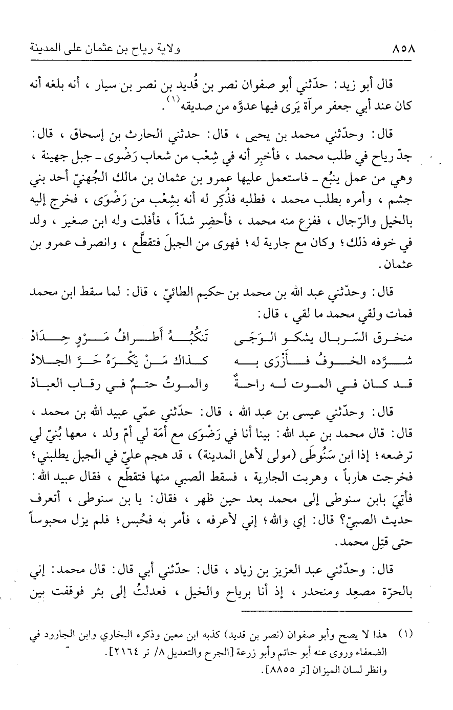 قال: وحدّثني عبد العزيز بن زياد، قال: حدّثني أبي قال: قال محمد: إني بالحرّة لمصعِد ومنحدر، إذ أنا برياح والخيل، فعدلتُ إلى بئر فوقفت بين