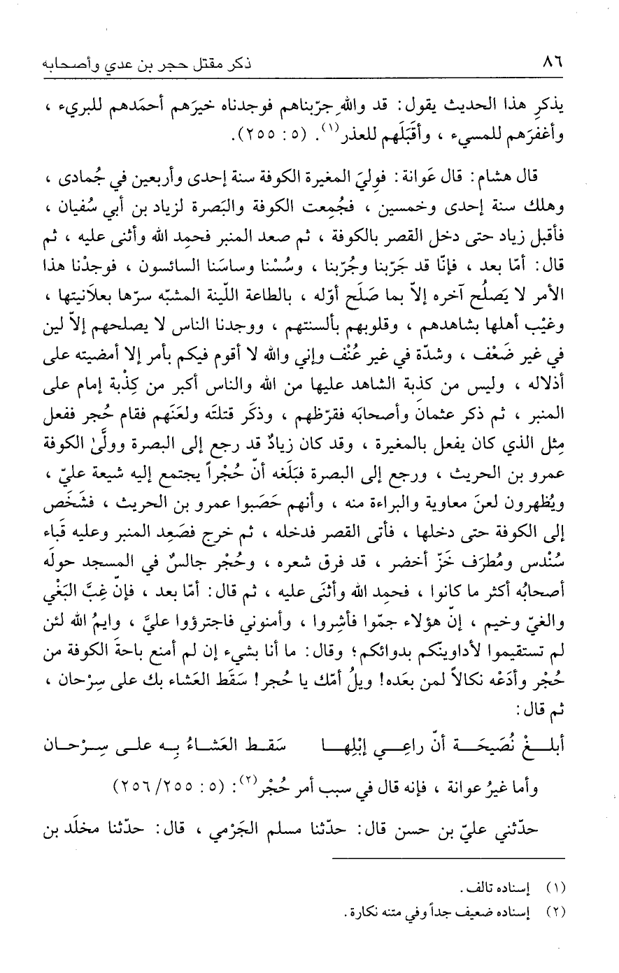 قال هشام: قال عَوانة: فوِليَ المغيرة الكوفة سنة إحدى وأربعين في جُمادى، وهلك سنة إحدى وخمسين، فجُمِعت الكوفة والبَصرة لزياد بن أبي سُفيان، فأقبل زياد حتى دخل القصر بالكوفة، ثم صعد المنبر فحمِد الله وأثنى عليه، ثم قال: أمّا بعد، فإنّا قد جَرّبنا وجُرّبنا، وسُسْنا وساسَنا السائسون، فوجدْنا هذا الأمر لا يَصلُح آخره إلّا بما صلَح أوّله، بالطاعة اللّينة المشبّه سرّها بعلَانيتها، وغيْب أهلها بشاهدهم، وقلوبهم بألسنتهم، ووجدنا الناس لا يصلحهم إلّا لين في غير ضَعْف، وشدّة في غير عُنْف وإني والله لا أقوم فيكم بأمر إلا أمضيته على أذلاله، وليس من كذبة الشاهد عليها من الله والناس أكبر من كِذْبة إمام على المنبر، ثم ذكر عثمانَ وأصحابَه فقرّظهم، وذكَر قتلتَه ولعَنَهم فقام حُجر ففعل مِثل الذي كان يفعل بالمغيرة، وقد كان زيادٌ قد رجع إلى البصرة وولَّى الكوفة عمرو بن الحريث، ورجع إلى البصرة فبَلَغه أنّ حُجْرًا يجتمع إليه شيعة عليّ، ويُظهرون لعنَ معاوية والبراءة منه، وأنهم حَصَبوا عمرو بن الحريث، فشَخَص إلى الكوفة حتى دخلها، فأتى القصر فدخله، ثم خرج فصَعِد المنبر وعليه قَباء سُنْدس ومُطرَف خَزّ أخضر، قد فرق شعره، وحُجْر جالسٌ في المسجد حولَه أصحابُه أكثر ما كانوا، فحمِد الله وأثنَى عليه، ثم قال: أمّا بعد، فإنّ غِبَّ البَغْي والغيّ وخيم، إنّ هؤلاء جمّوا فأشِروا، وأمنوني فاجترؤوا عليَّ، وايمُ الله لئن لم تستقيموا لأداوينّكم بدوائكم؛ وقال: ما أنا بشيء إن لم أمنع باحةَ الكوفة من حُجْر وأدَعْه نكالًا لمن بعَده! ويلُ أمّك يا حُجر! سَقَط العَشاء بك على سِرْحان، ثم قال: