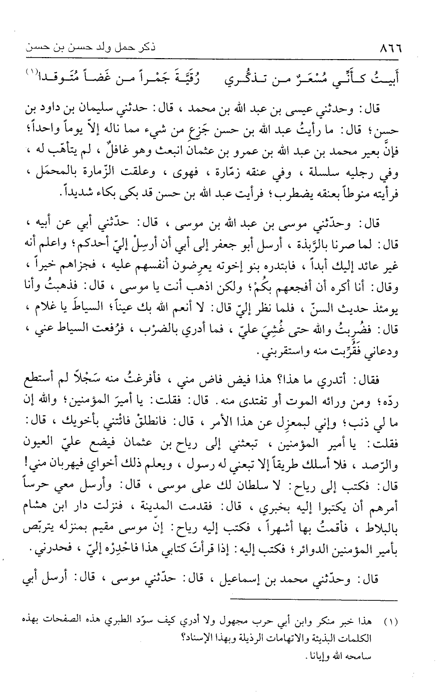قال: وحدثني عيسى بن عبد الله بن محمد، قال: حدثني سليمان بن داود بن حسن، قال: ما رأيتُ عبد الله بن حسن جَزعِ من شيء مما ناله إلّا يومًا واحدًا؛ فإنَّ بعير محمد بن عبد الله بن عمرو بن عثمان انبعث وهو غافلٌ، لم يتأهّب له، وفي رجليه سلسلة، وفي عنقه زمّارة، فهوى، وعلقت الزّمارة بالمحمَل، فرأيته منوطًا بعنقه يضطرب، فرأيت عبد الله بن حسن قد بكى بكاء شديدًا.