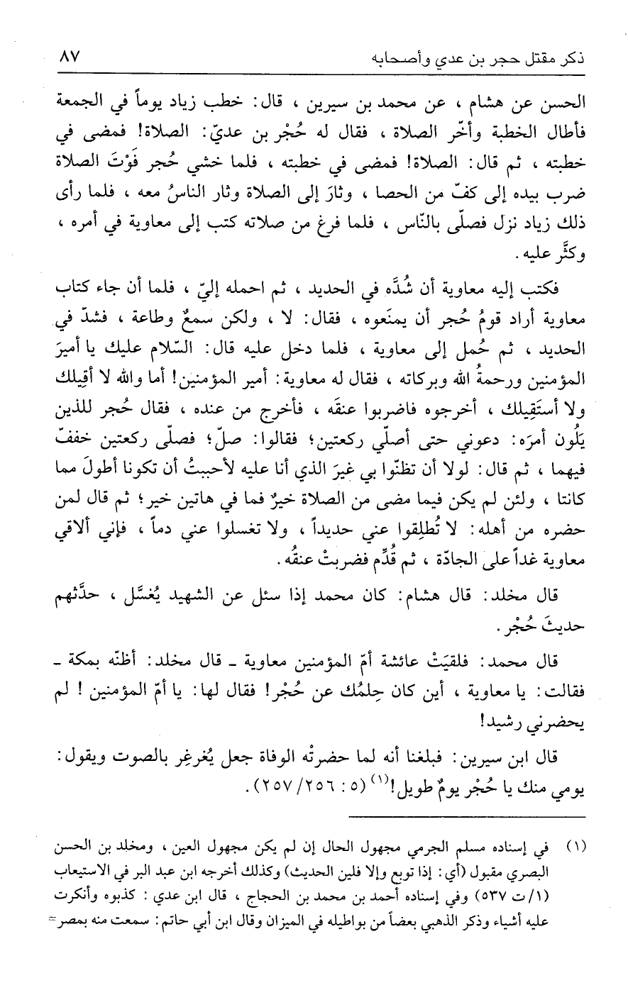 فكتب إليه معاوية أن شُدَّه في الحديد، ثم احمله إليّ، فلما أن جاء كتاب معاوية أراد قومُ حُجر أن يمنَعوه، فقال: لا، ولكن سمعٌ وطاعة، فشدّ في الحديد، ثم حُمل إلى معاوية، فلما دخل عليه قال: السّلام عليك يا أميرَ المؤمنين ورحمةُ الله وبركاته، فقال له معاوية: أمير المؤمنين! أما والله لا أقِيلك ولا أستَقِيلك، أخرجوه فاضربوا عنقَه، فأخرج من عنده، فقال حُجر للذين يَلُون أمرَه: دعوني حتى أصلّي ركعتين؛ فقالوا: صلّ؛ فصلّى ركعتين خففّ فيهما، ثم قال: لولا أن تظنّوا بي غيرَ الذي أنا عليه لأحببتُ أن تكونا أطولَ مما كانتا، ولئن لم يكن فيما مضى من الصلاة خيرٌ فما في هاتين خير؛ ثم قال لمن حضره من أهله: لا تُطلِقوا عني حديدًا، ولا تغسلوا عني دمًا، فإني ألاقي معاوية غدًا على الجادّة، ثم قُدِّم فضربتْ عنقُه.