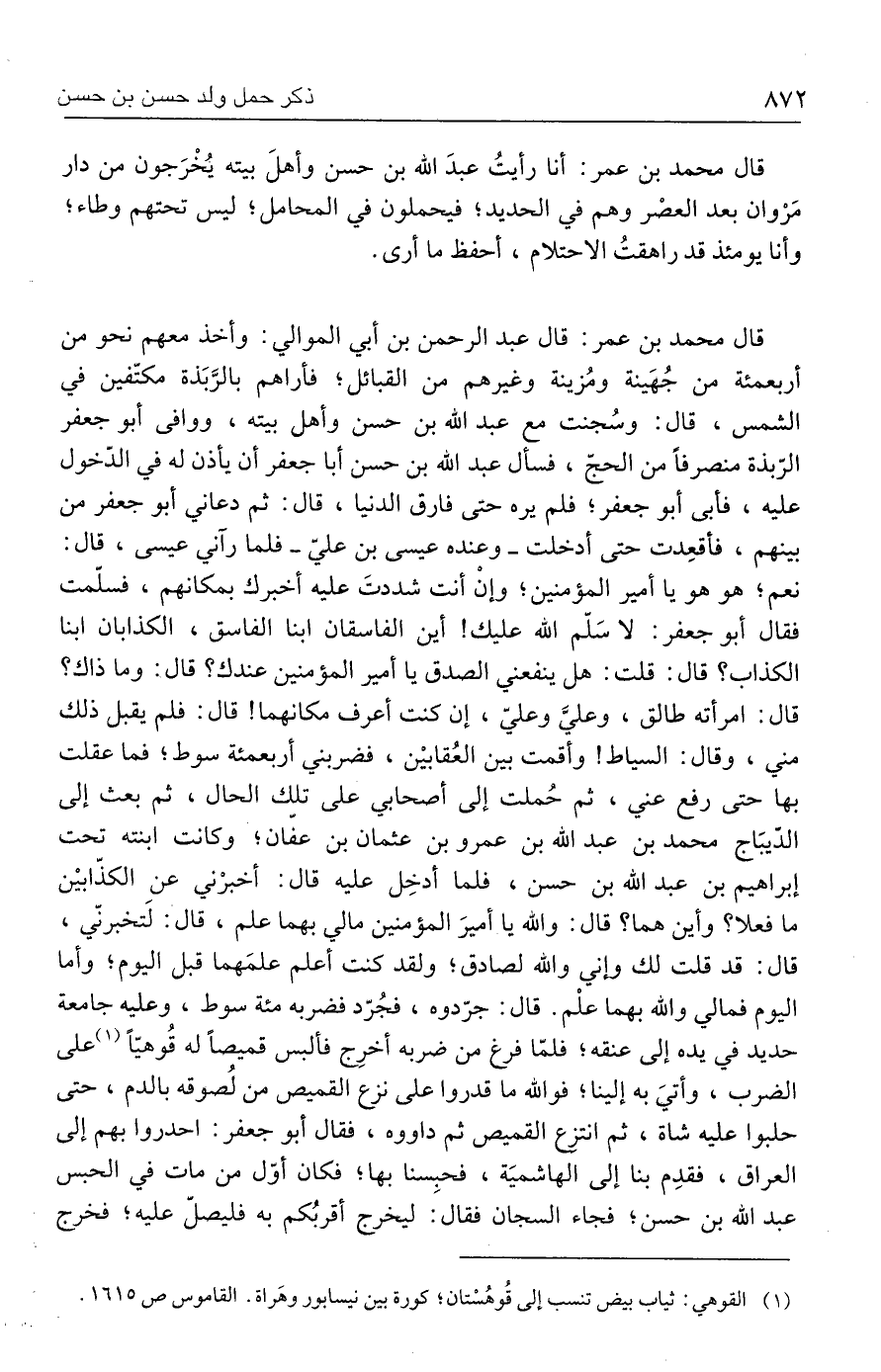قال محمد بن عمر: أنا رأيتُ عبدَ الله بن حسن وأهلَ بيته يُخْرَجون من دار مَرْوان بعد العصر وهم في الحديد؛ فيحملون في المحامل؛ ليس تحتهم وطاء؛ وأنا يومئذ قد راهقتُ الاحتلام، أحفظ ما أرى.