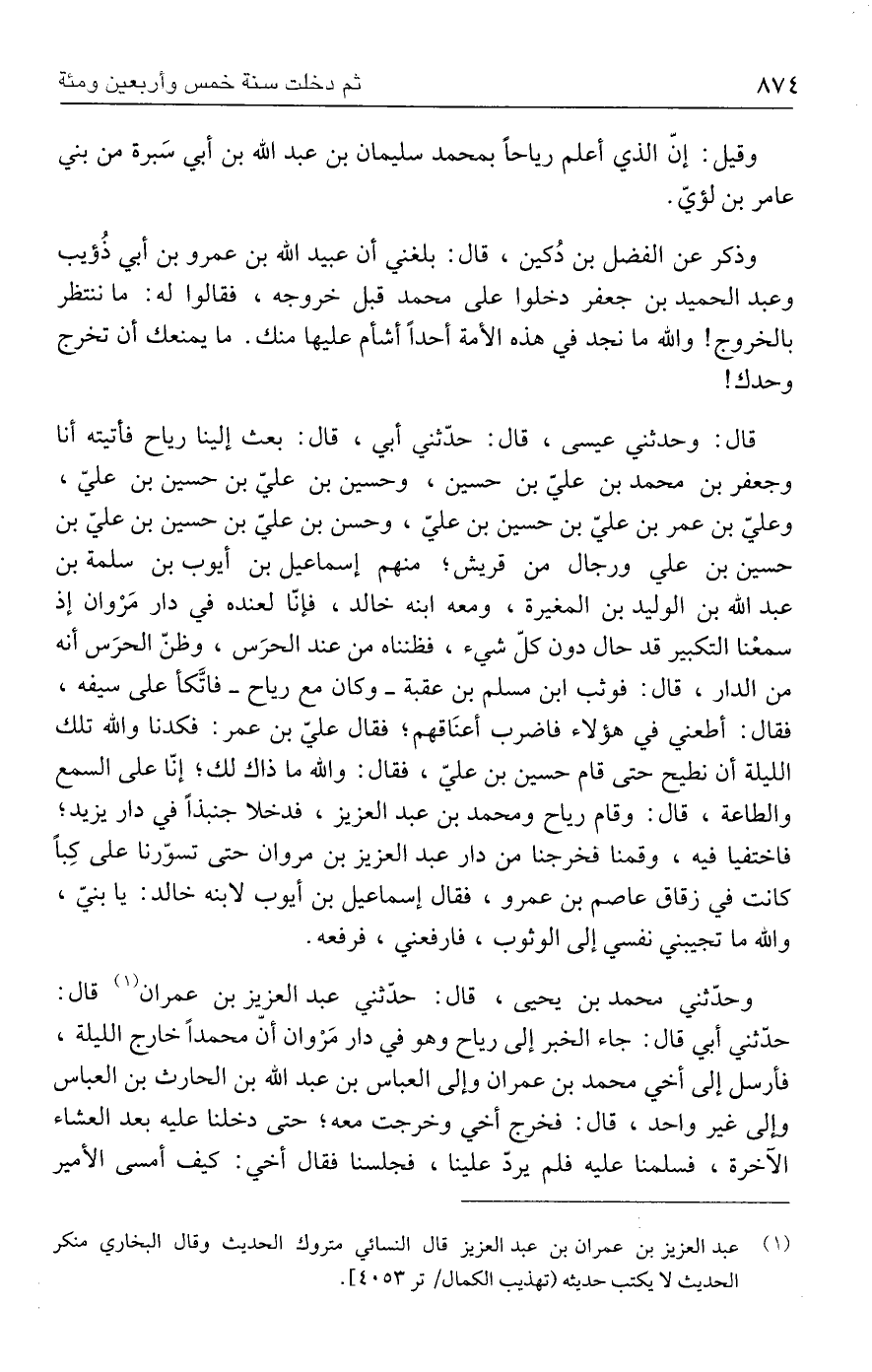 وحدّثني محمد بن يحيى، قال: حدّثني عبد العزيز بن عمران (١) قال: حدّثني أبي قال: جاء الخبر إلى رياح وهو في دار مَرْوان أنّ محمدًا خارج الليلة، فأرسل إلى أخي محمد بن عمران وإلى العباس بن عبد الله بن الحارث بن العباس وإلى غير واحد، قال: فخرج أخي وخرجت معه، حتى دخلنا عليه بعد العشاء الآخرة، فسلمنا عليه فلم يردّ علينا، فجلسنا فقال أخي: كيف أمسى الأمير