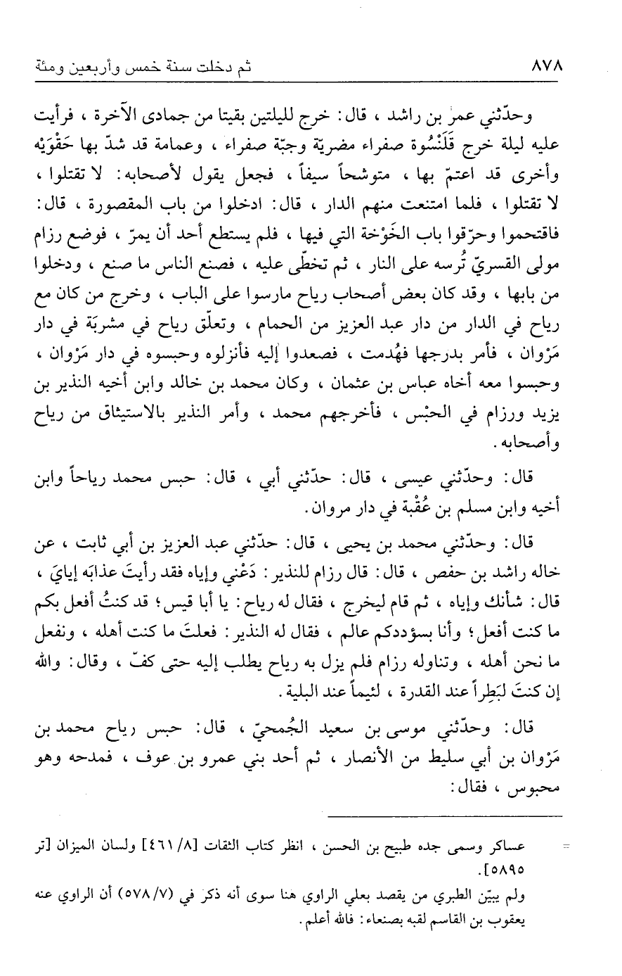 قال: وحدّثني عيسى، قال: حدّثني أبي، قال: حبس محمد رياحًا وابن أخيه وابن مسلم بن عُقْبة في دار مروان.