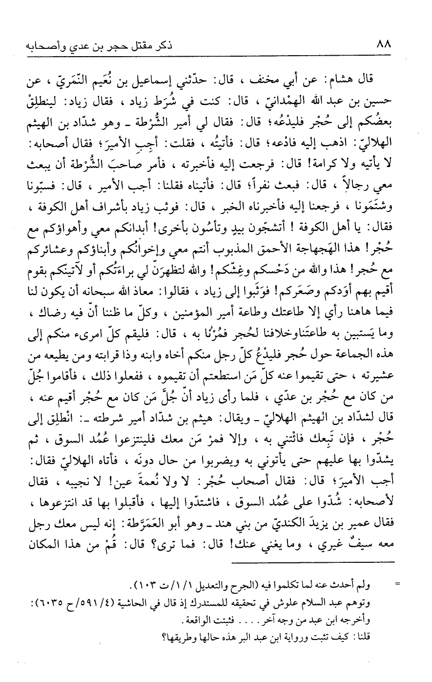 قال هشام: عن أبي مخنف، قال: حدّثني إسماعيل بن نُعَيم النّمَريّ، عن حسين بن عبد الله الهمْدانيّ، قال: كنت في شُرَط زياد، فقال زياد: لينطلِقْ بعضُكم إلى حُجْر فليدْعُه؛ قال: فقال لي أمير الشُّرْطة - وهو شدّاد بن الهيثم الهلاليّ: اذهب إليه فادْعه؛ قال: فأتيتُه، فقلت: أجِبِ الأميرَ؛ فقال أصحابه: لا يأتيه ولا كرامة! قال: فرجعت إليه فأخبرته، فأمر صاحبَ الشُّرْطة أن يبعث معي رجالًا، قال: فبعث نفرًا؛ قال: فأتيناه فقلنا: أجب الأمير، قال: فسبّونا وشتَمَونا، فرجعنا إليه فأخبرناه الخبر، قال: فوثب زياد بأشراف أهل الكوفة، فقال: يا أهل الكوفة! أتشجّون بيدٍ وتأسُون بأخرى! أبدانكم معي وأهواؤكم مع حُجْر! هذا الهَجهاجة الأحمق المذبوب أنتم معي وإخوانُكم وأبناؤكم وعشائركم مع حُجر! هذا والله من دَحْسكم وغِشّكم! والله لتظهرَنّ لي براءَتُكم أو لآتينّكم بقوم أقيم بهم أوَدكم وصَعَركم! فوَثَبوا إلى زياد، فقالوا: معاذ الله سبحانه أن يكون لنا فيما هاهنا رأي إلا طاعتك وطاعة أمير المؤمنين، وكلّ ما ظننا أنّ فيه رضاك، وما يَستبين به طاعتَنا وخلافنا لحُجر فمُرْنا به، قال: فليقم كلّ امرئ منكم إلى هذه الجماعة حول حُجر فليدْعُ كلّ رجل منكم أخاه وابنه وذا قرابته ومن يطيعه من عشيرته، حتى تقيموا عنه كلّ مَن استطعتم أن تقيموه، ففعلوا ذلك، فأقاموا جُلّ من كان مع حُجْر بن عدّي، فلما رأى زياد أنّ جُلَّ مَن كان مع حُجْر أقيم عنه، قال لشدّاد بن الهيثم الهلاليّ - ويقال: هيثم بن شدّاد أمير شرطته -: انْطلِق إلى حُجْر، فإن تَبِعك فائْتني به، وإلا فمرْ مَن معك فلينتزعوا عُمُد السوق، ثم يشدّوا بها عليهم حتى يأتوني به ويضربوا من حال دونَه، فأتاه الهلاليّ فقال: أجب الأميرَ؛ قال: فقال أصحاب حُجْر: لا ولا نُعمةَ عين! لا نجيبه، فقال لأصحابه: شُدّوا على عُمُد السوق، فاشتدّوا إليها، فأقبلوا بها قد انتزعوها، فقال عمير بن يزيدَ الكنديّ من بني هند - وهو أبو العَمَرَّطة: إنه ليس معك رجل معه سيفٌ غيري، وما يغني عنك! قال: فما ترى؟ قال: قُمْ من هذا المكان