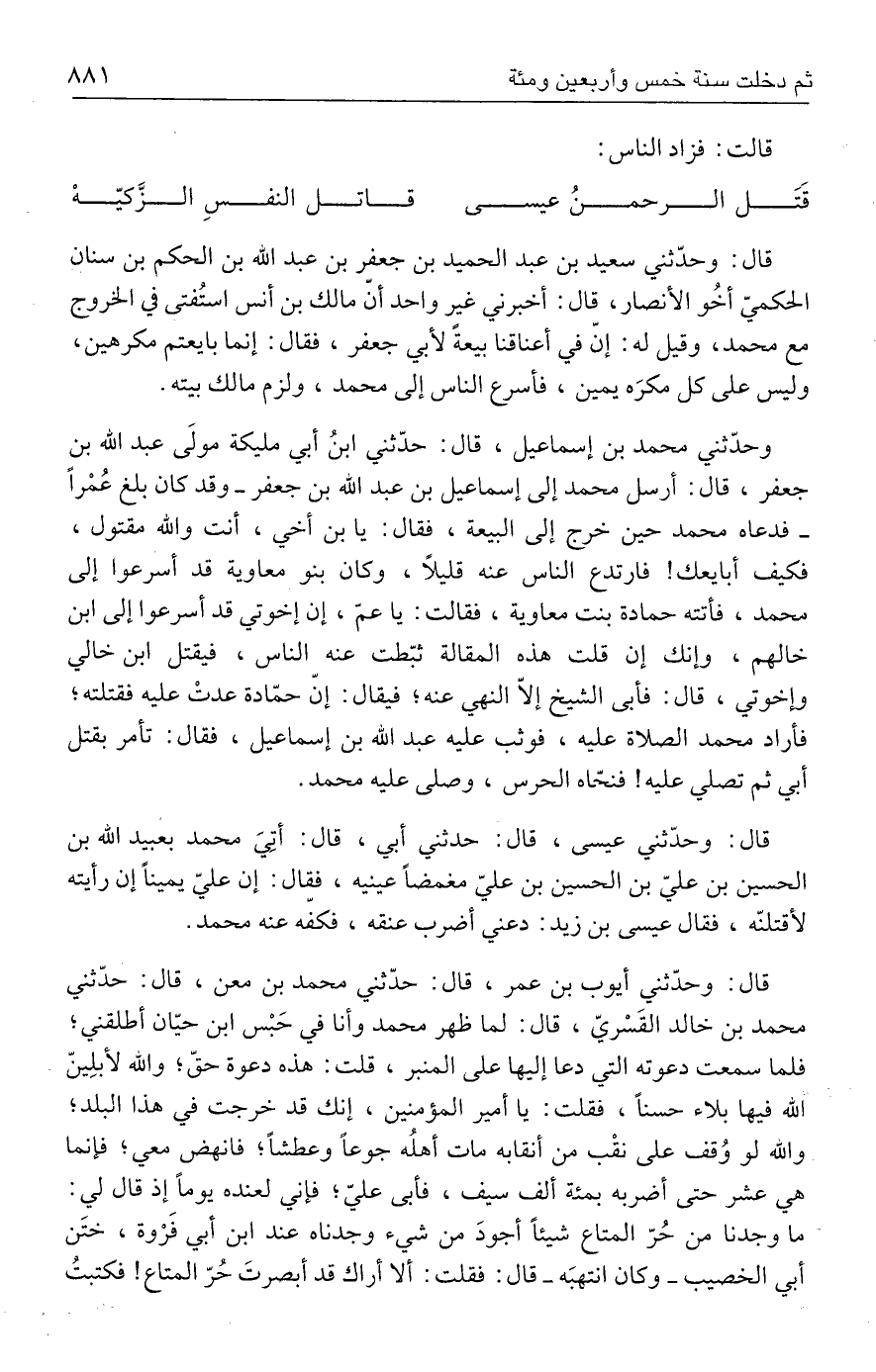 قال: وحدّثني عيسى، قال: حدثني أبي، قال: أتِيَ محمد بعبيد الله بن الحسين بن عليّ بن الحسين بن عليّ مغمضًا عينيه، فقال: إن عليّ يمينًا إن رأيته لأقتلنّه، فقال عيسى بن زيد: دعني أضرب عنقه، فكفّه عنه محمد.