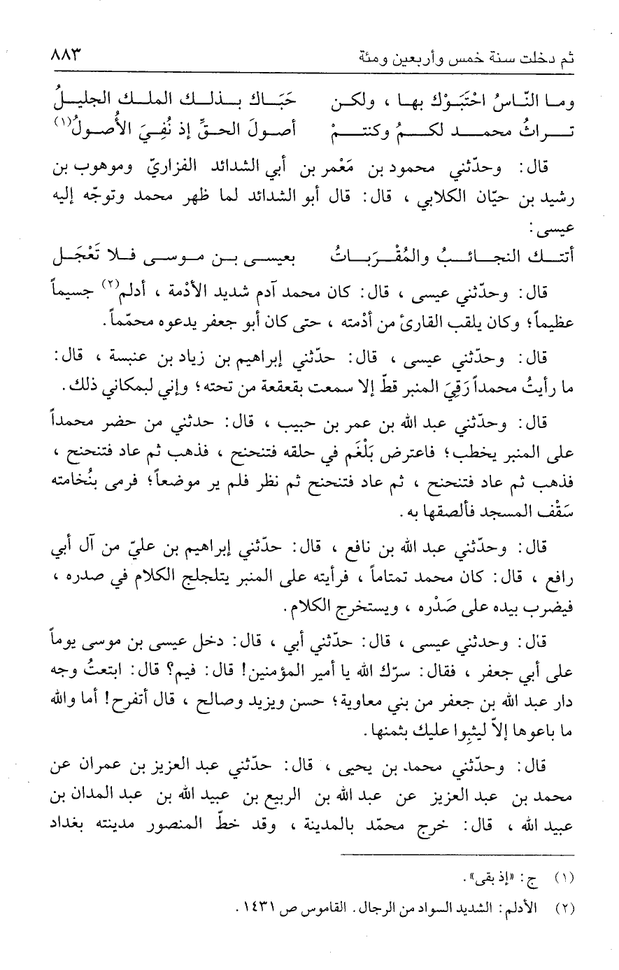 قال: وحدّثني عيسى، قال: كان محمد آدم شديد الأدْمة، أدلم (٢) جسيمًا عظيمًا؛ وكان يلقب القارئ من أدْمته، حتى كان أبو جعفر يدعوه محمّمًا.